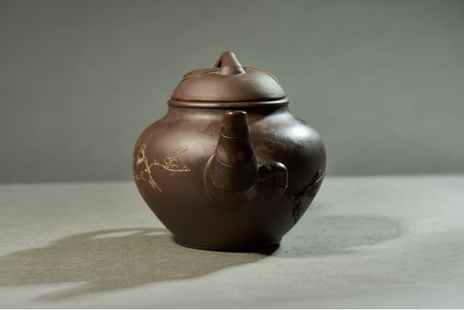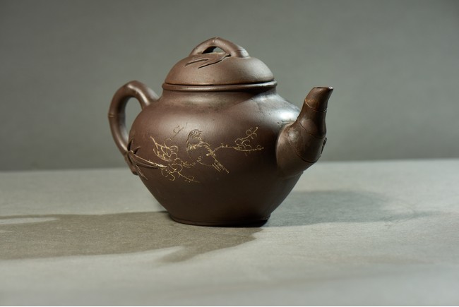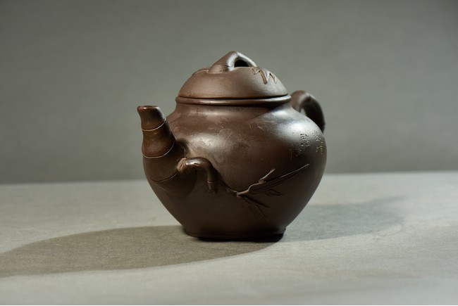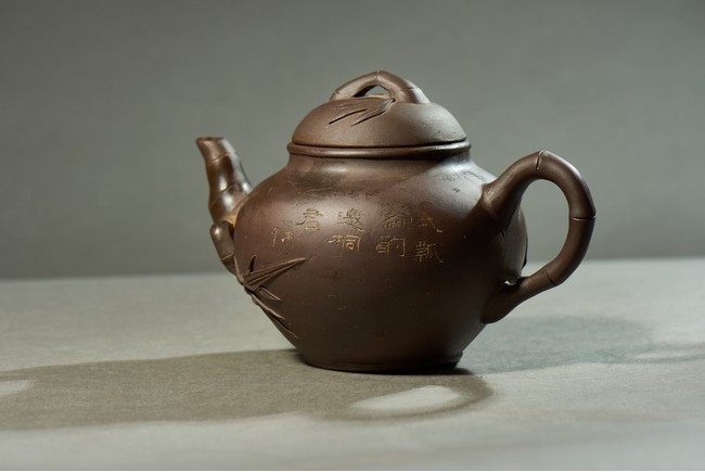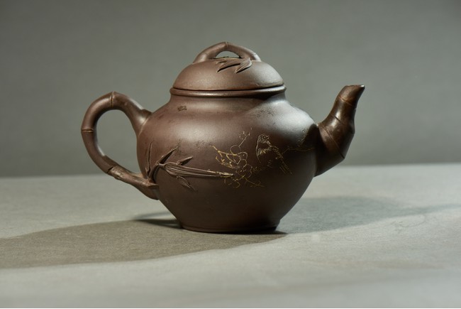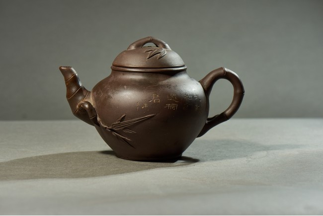 The bulbous body inscribed with inscriptions, with bamboo formed handle, spout, and cover.