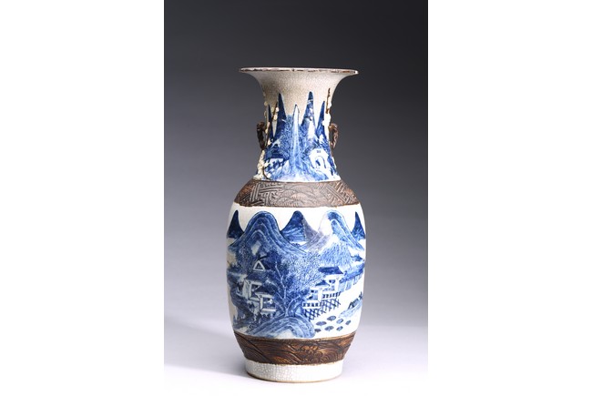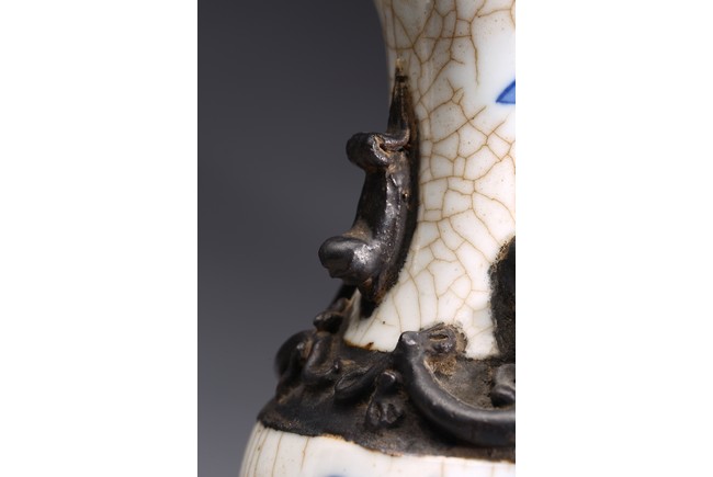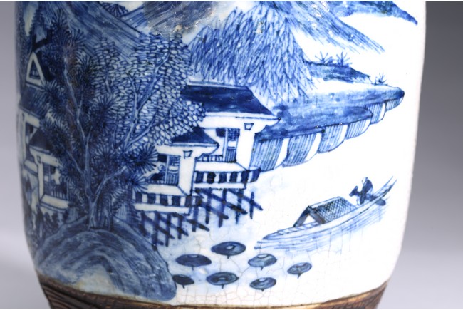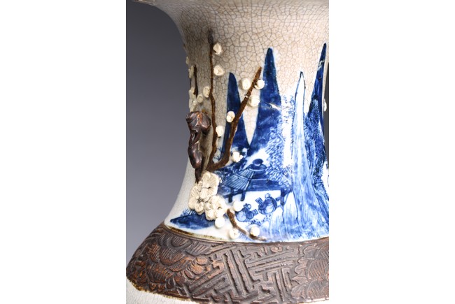 Comprising of three vases, each decorated in blue and white to the body depicting peacocks or landscape scenes, the neck carved with raised chilong decorations and plum blossoms, overall with crackled pattern. Qing Dynasty period.