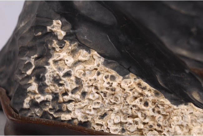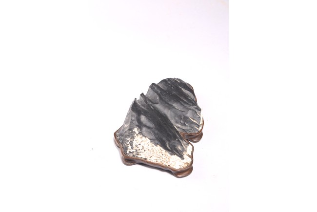 The fine grained stone with white inclusions towards the bottom, in the form of a low mountain range, wood stand. Qing Dynasty period.