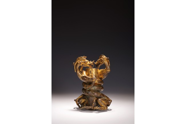 A GILT BRONZE MODEL OF 'TWIN DRAGON    銅鎏金雙龍戲柱擺件