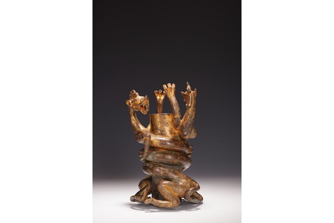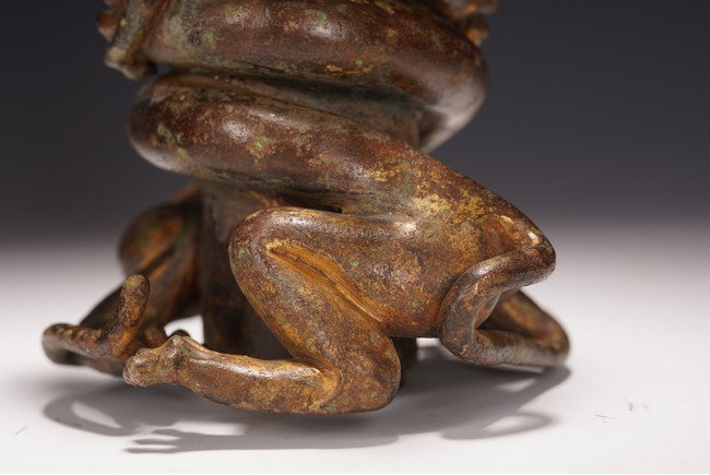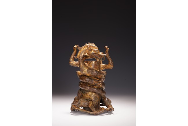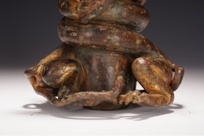 此擺件以精銅為材,通體鎏金工藝,精雕兩條環柱交纏的螭龍,龍身遒勁有力,龍目猙獰卻不失霸氣。整體造型別緻,工藝精湛,古樸而不施華麗,包漿自然,文房精美擺件,值得收藏。