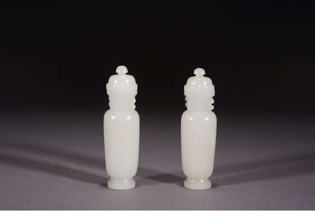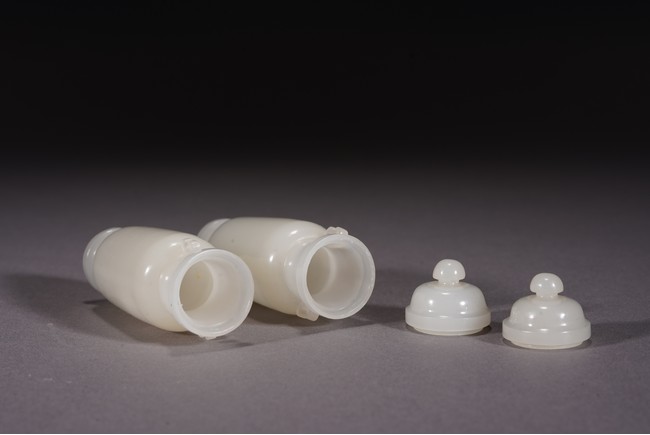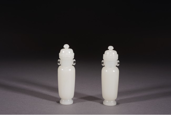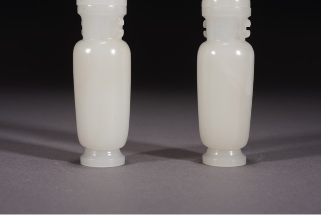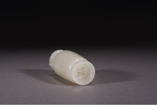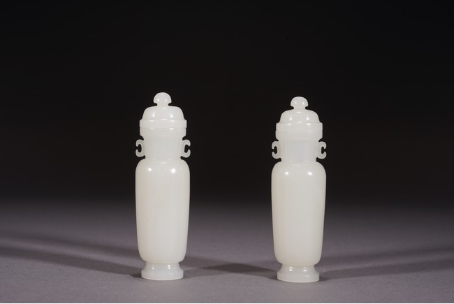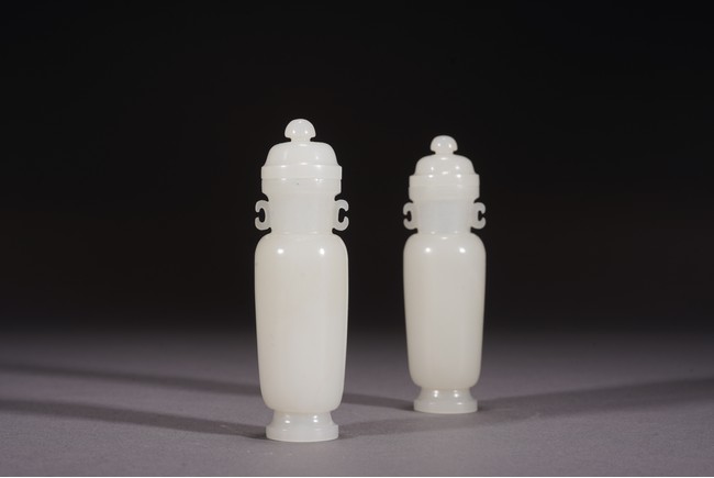 瓶帶蓋,子母口,短頸,飾雙耳,鼓腹下收,通體光素無紋,用上等羊脂白玉制 作而成,玉質純淨,瑩潤無暇,質白細膩,玻璃感極強。形制規整,素雅秀美, 充分顯示出玉石的“體如凝脂,精光內蘊,質厚溫潤,脈理緊密”之本。 “乾隆 年制”款識,字跡工整,排列整齊,爲案頭陳設佳品。