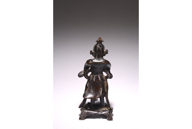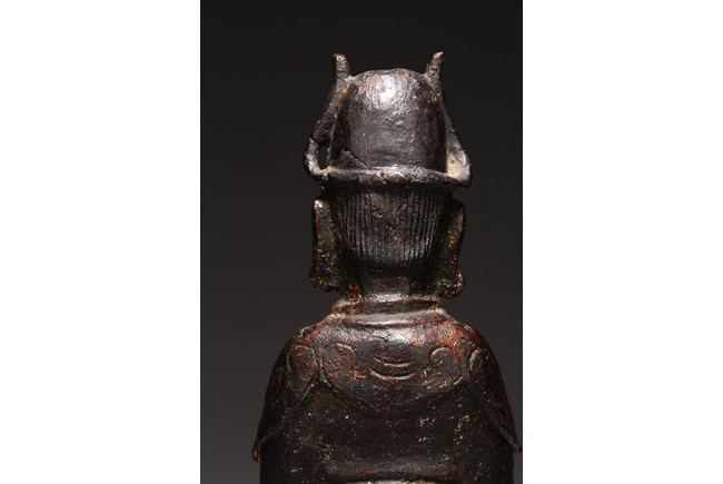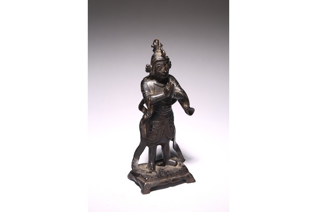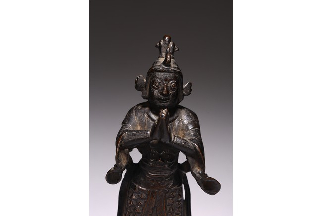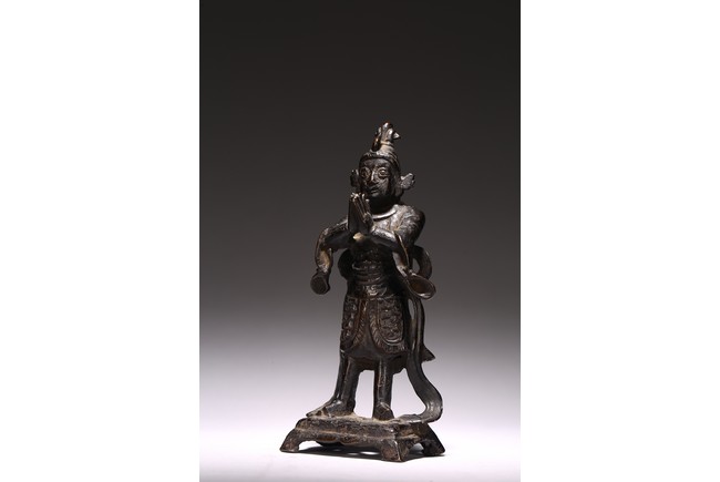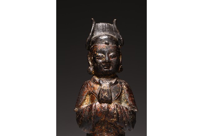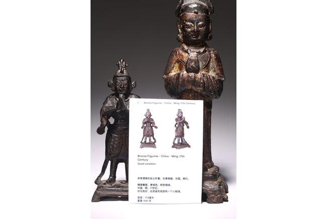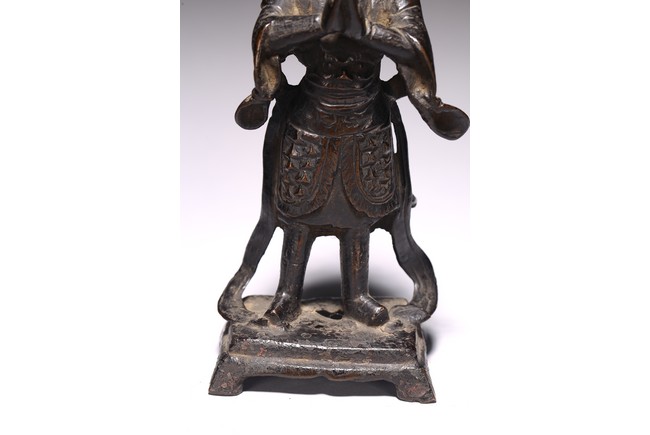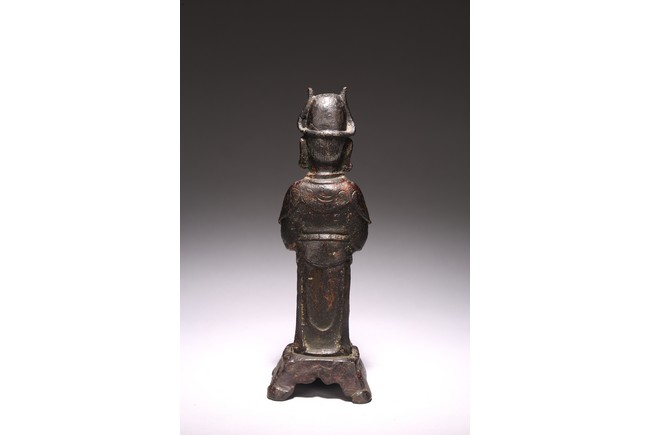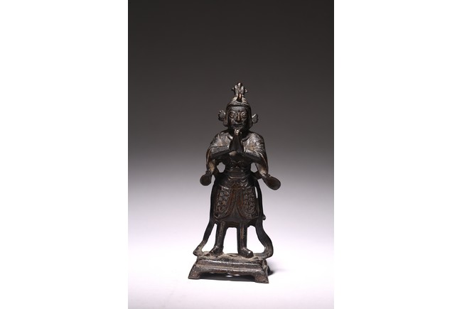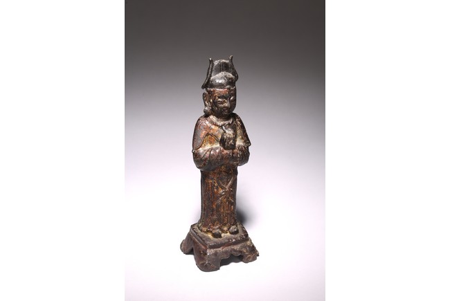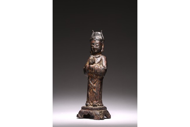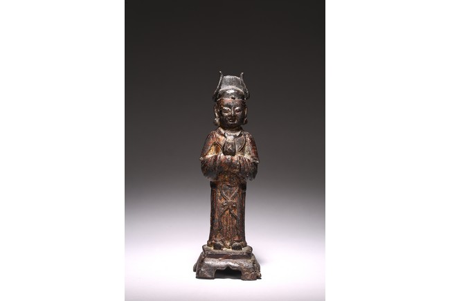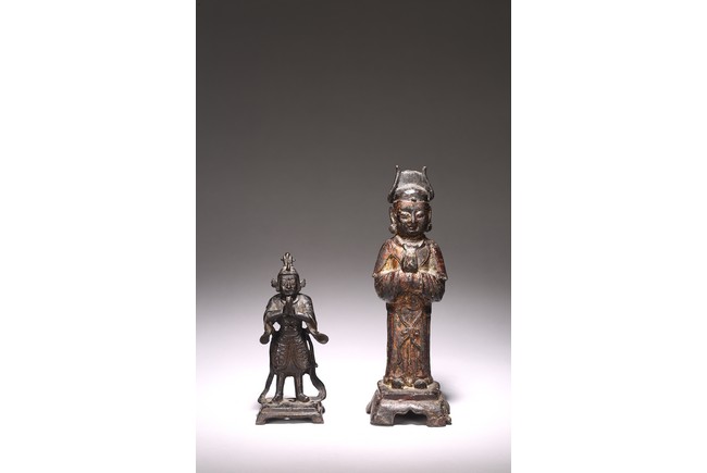 Chinese. Comprising of a standing official figure holding a tablet in front of chest and wearing an official's cap; the other with hands clasped and wearing suit of armour and celestial scarves. Ming Dynasty period.