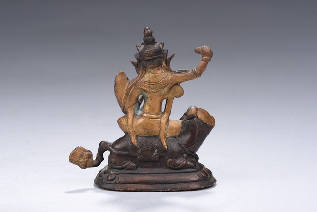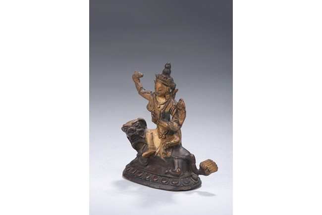 The deity is shown seated upon a lion with ferocious expression and mouth agape, he is adorned with beaded necklace, with right hand raised holding a sword, which missing the blade, his hair tied into a chignon. Ming Dynasty period.
