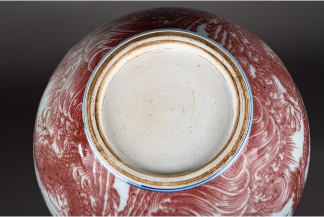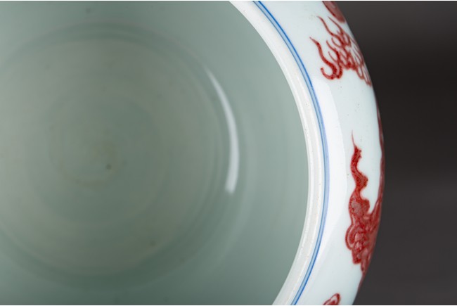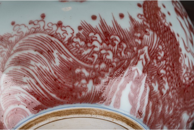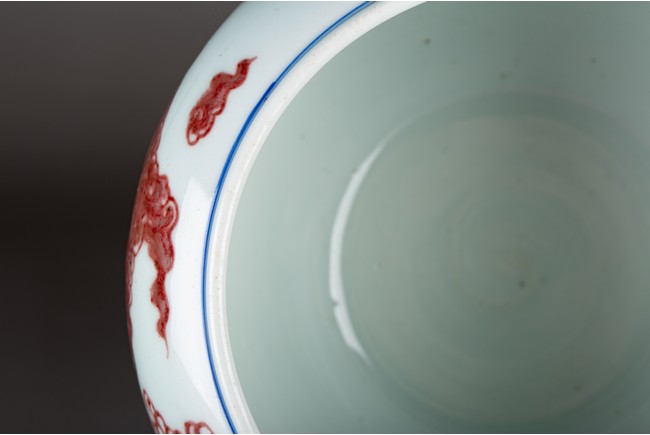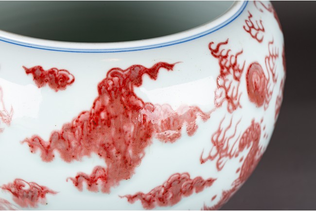 釉裡紅最早見於元代, 盛行於明初 。由於銅紅釉對燒製溫度的要求極高, 釉裡紅燒造難度 大、成功率低, 故而明中晚期極少得見。清康熙時期, 景德鎮官窯才又製作出水平極高的釉 裡紅器, 此缸即是同類器中的佼佼者。缸圓唇斂口 、鼓腹渾圓 、砂底, 胎體厚重, 器形飽滿端莊, 釉水肥潤, 顏色鮮明 。通體釉 裡紅裝飾, 繪“海水龍紋”, 巧綴青花點睛, 起畫龍點睛作用。龍首修長, 龍角順貼於首後, 龍爪鋒銳有力, 龍身姿態遒勁, 背鰭分明, 四肢矯健, 姿態跋扈, 動勢鮮活, 四周祥雲繚繞, 雄碩遒勁, 威儀橫貫, 氣奪千里 。釉裡紅一色妍麗, 紋飾強而有力, 所施釉裡紅一色妍麗, 髮色於市場流通中為極上品, 含蓄之美宛如佳人初醉, 與青花明快鮮亮之色, 相互輝映。
