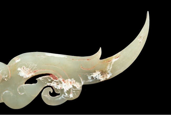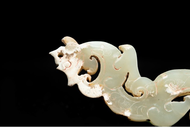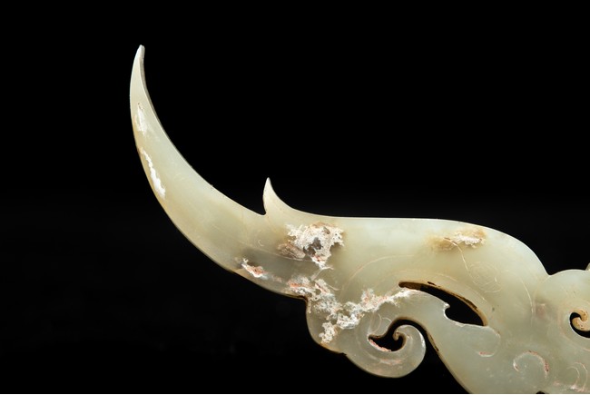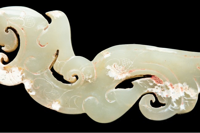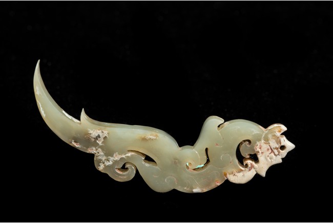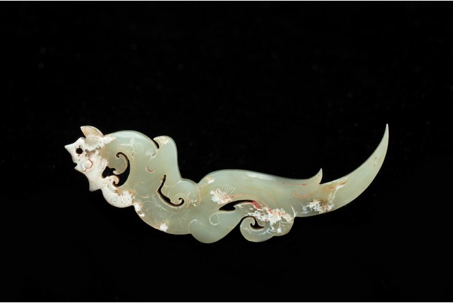 Chinese. Of flat crescent Shaped, delicately carved in openwork as a dragon in profile with its head depicted with a circular eye, an open jaw and a curled crest, its body tapering to a backward curving tail, the stone of celadon tone with areas of white calcification. Western Han Dynasty period.
