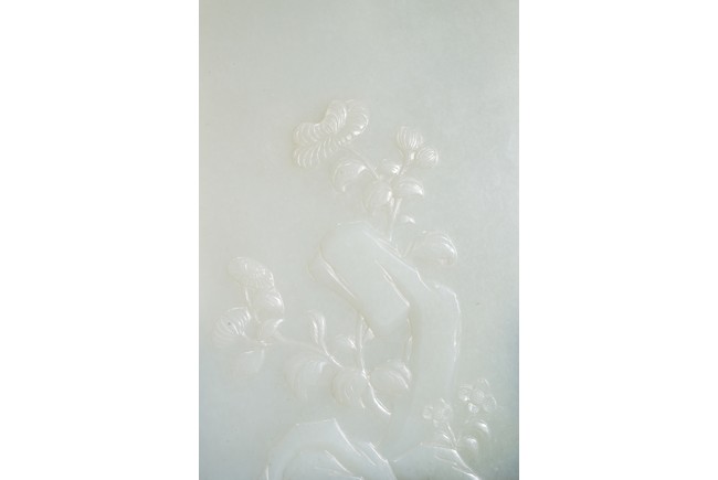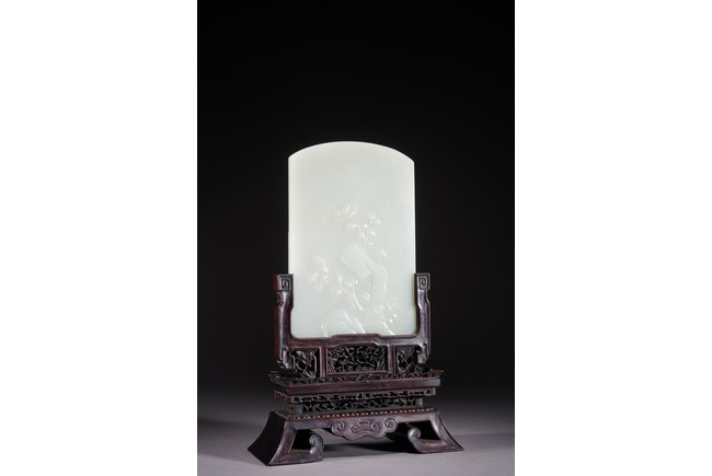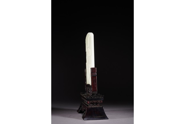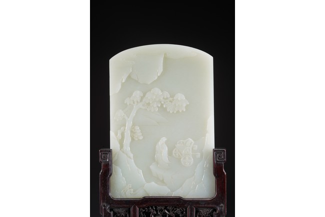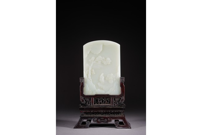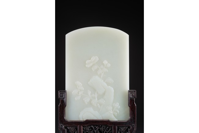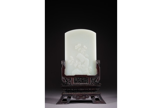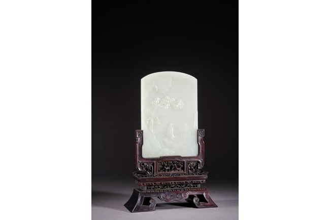 Chinese. Carved in relief to the front with a literati figure pondering underneath a pine next to a wheelchair upon a rocky outcrop, the reverse carved with chrysanthemum issuing from rockwork, the stone is of polished even white tone, all supported on well carved and pierced zitan stand. Mid Qing Dynasty period.