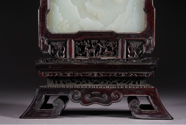 插屏紫檀滿雕底座,白玉插屏板,用料碩大規整,有厚度與精美的弧度,正面雕琢松下高士圖,雕工精湛,佈局合理,畫面優美脫俗,背面雕琢菊石花卉紋飾,雅緻古樸,符合古意,為案頭賞玩佳器。