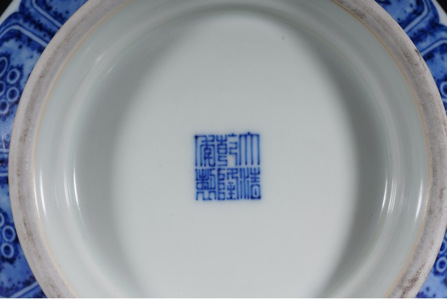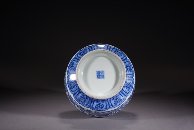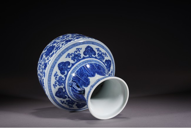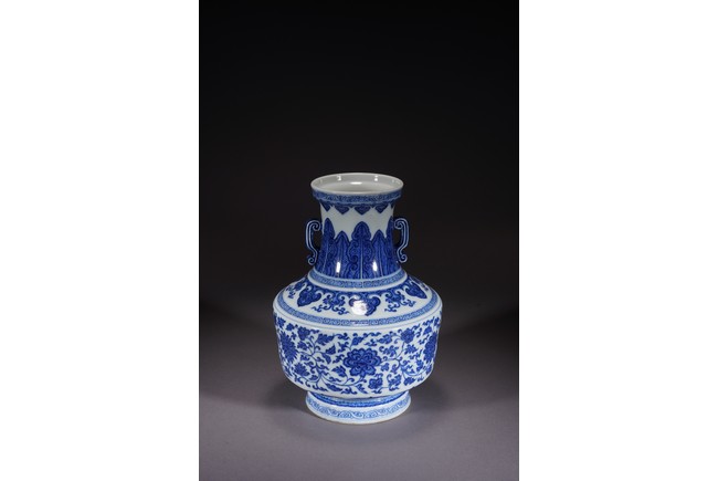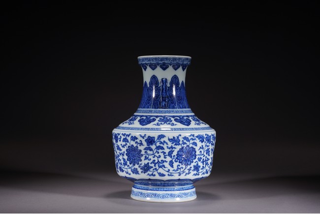本品直口,束頸,飾雙如意耳,直腹下收,圈足。青花滿飾紋飾,上部四周繪“卷草紋” “倒掛如意紋”“回紋”“蕉葉紋”;腹部爲主體,繪纏枝蓮紋,其佈局疏密有致,活潑婉轉, 毫無拘泥拖沓之感;圈足繪“卷草紋”一周。小而細碎的捲草紋,襯托“纏枝蓮紋”之間, 其流轉間精到的筆觸與自然活潑的意蘊完美融合。整體線條秀美,形制莊重典雅,胎質細膩 潔白,青花發色明快,紋飾描繪細膩。 “大清乾隆年制”款識。