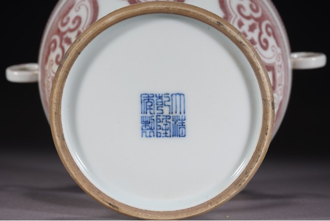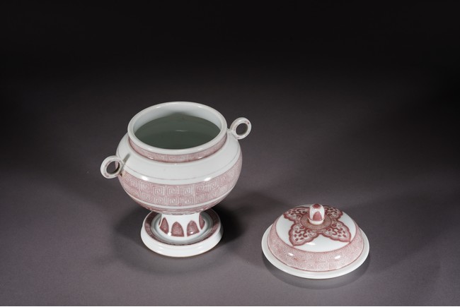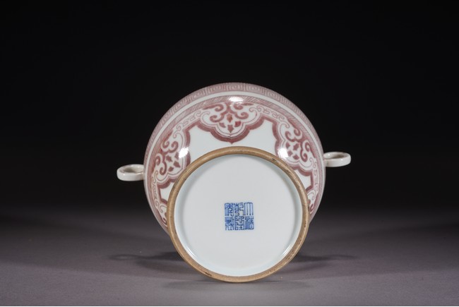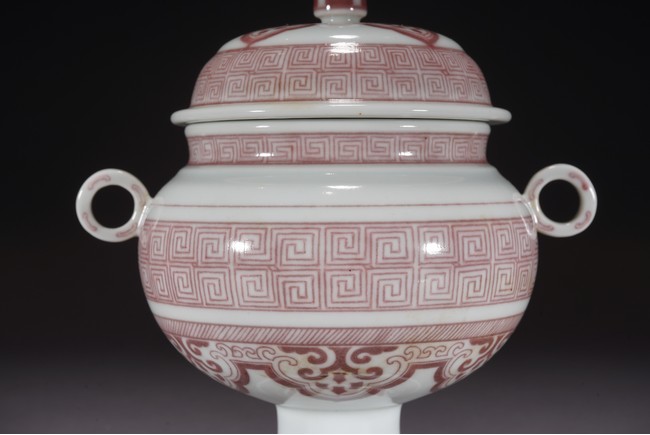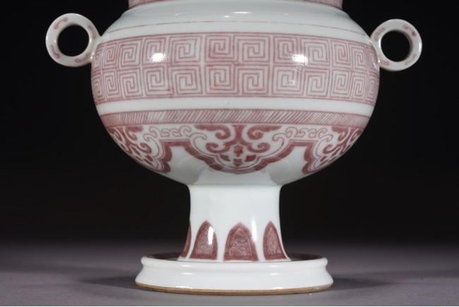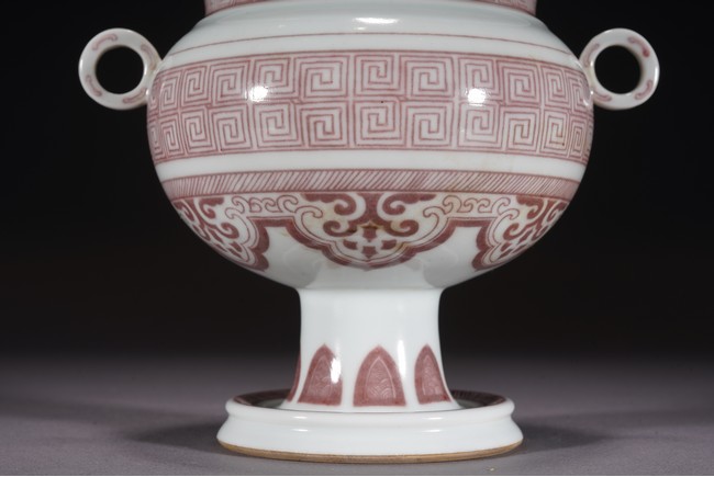 釉裏紅燒造工藝繁複,講究物理變化之妙,由於在燒成過程當中氧化銅離子遊離激烈, 往往 易於聚結,凹凸不平,若大面積塗飾,致使紋飾漫漶不清,遂成瑕疵;若火候氣氛掌握 不 準,其色或是暗沈,或是淺薄,皆不堪入目,影響美觀。本器造型仿製春秋時期青銅豆,帶蓋,蓋有圓形捉手,子母口,雙環耳,柄較粗而低矮, 胎質細致堅實,胎釉結合緻密, 釉面潔白,質地勻淨,釉質肥厚,瑩潤如玉。釉裏紅發色 穩定,明快豔麗,體現出窯工對火候極高的控制能力。 “大清乾隆年制”款識。