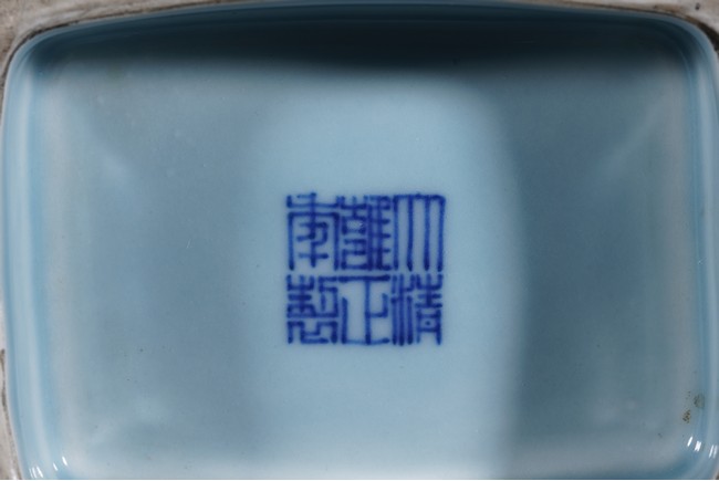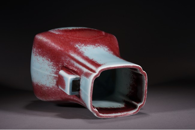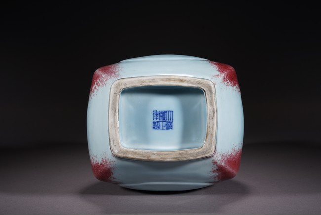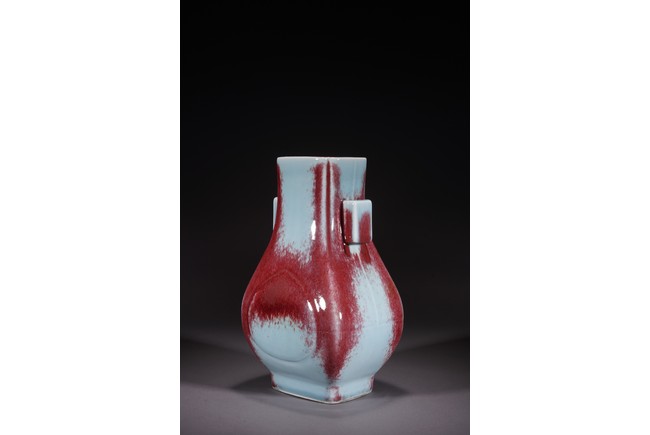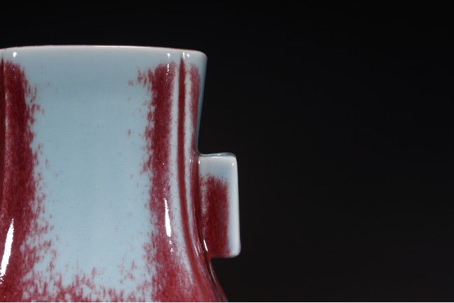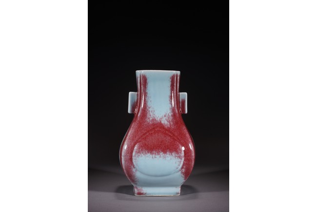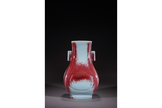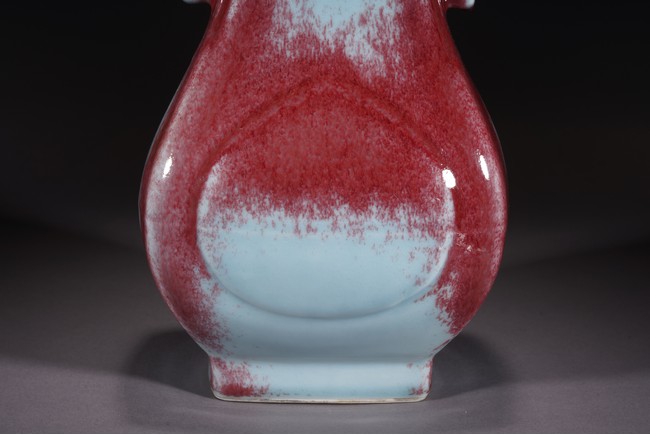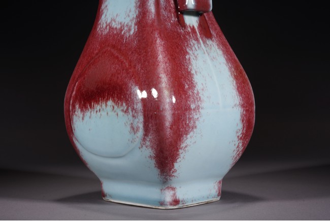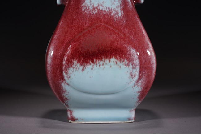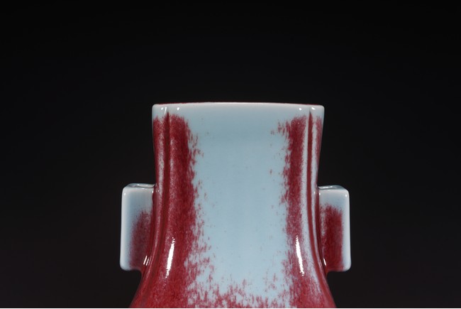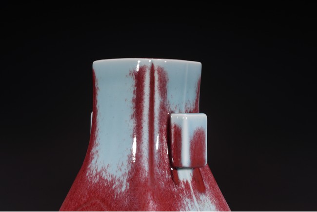 瓶口呈四方倭角形,長頸,鼓腹,長方形圈足。頸部飾雙貫耳,腹心突起杏圓。通身以 天藍色爲基調,紅釉絲絲縷縷四周垂墜,充滿流動之感。窯變釉肥厚潤澤,寶光晶瑩,呈色 異常美妙,青藍者幽寒如水,豔紅者熾烈如火,其交錯融流之狀,如風動雲霞,變幻莫測自 然流淌,在熔融過程中,呈現色彩斑瀾的釉色,千種風姿,萬般異彩。整器造型端莊挺拔、 古樸大氣,“大清雍正年制”款識。