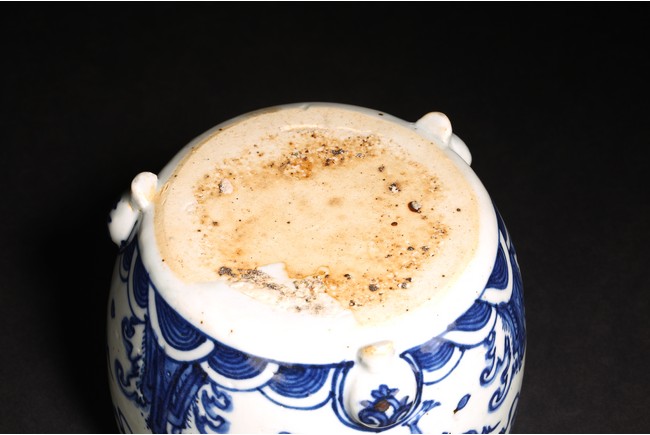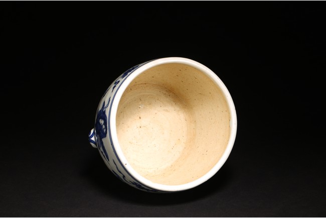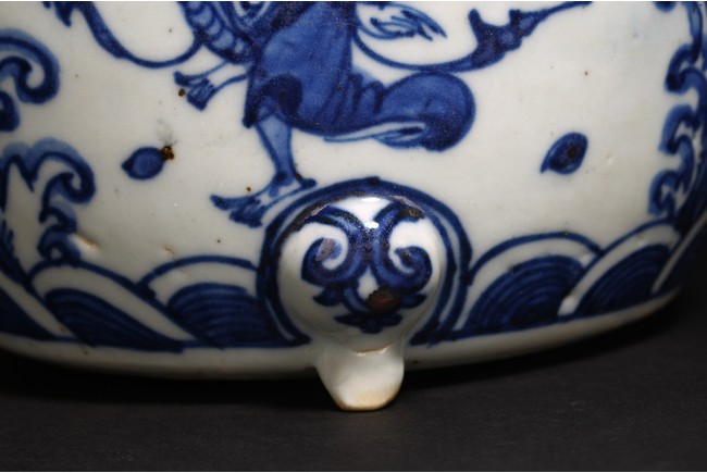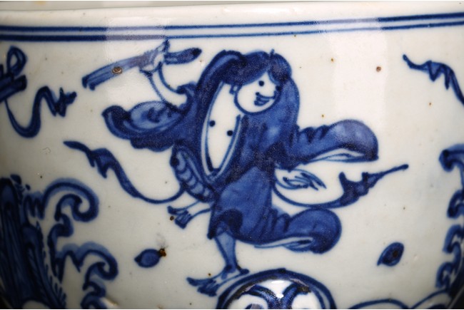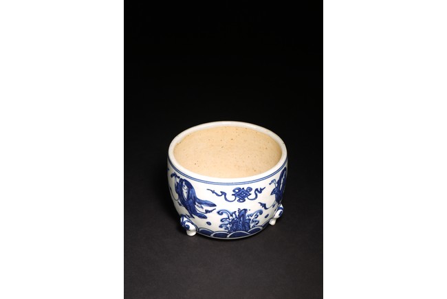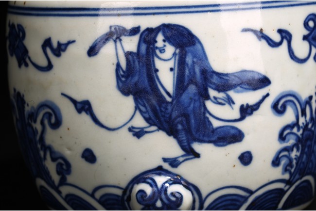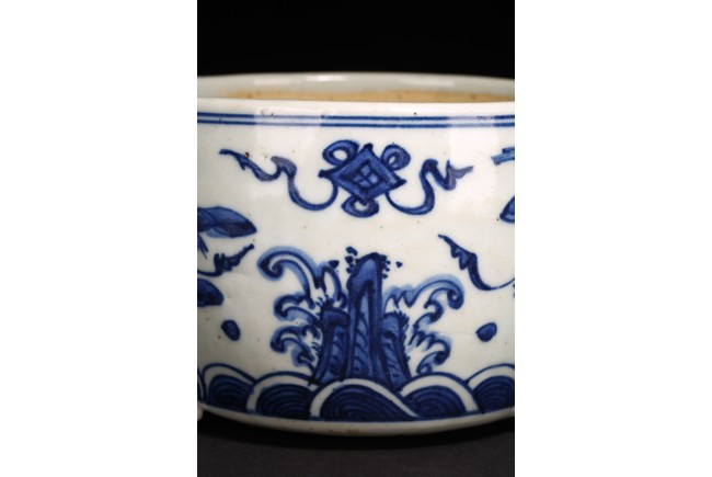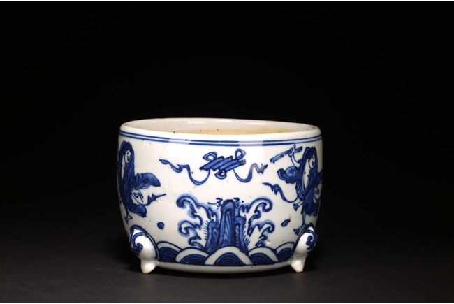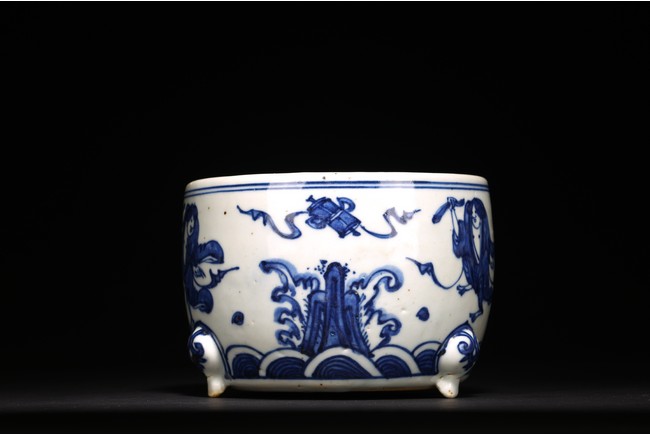 Chinese. The circular body with slightly rounded sides rising from three short feet, painted around the exterior in rich cobalt-blue tones with a continuous scene of Taoist immortals and auspicious motifs above sacred mountain, the base unglazed. Ming Dynasty Wanli period.