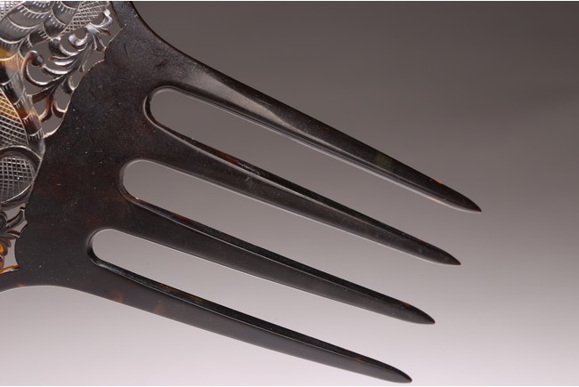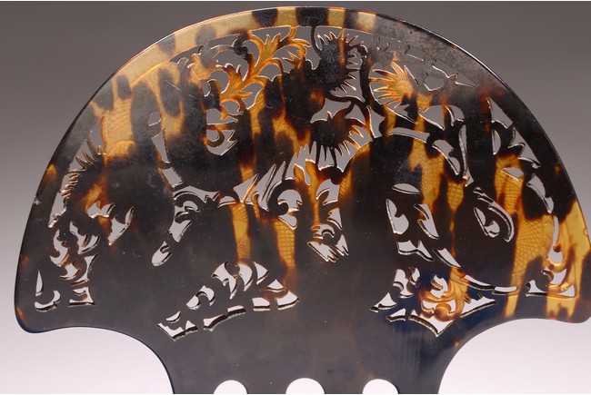 玳瑁製成, 呈扁平狀, 梳柄呈拱橋形, 上鏤空飾 “穿花龍紋” , 龍威武霸氣,側首回望, 嬉戲於花叢中, 下部梳齒排列整齊。
