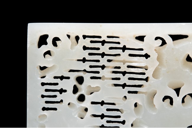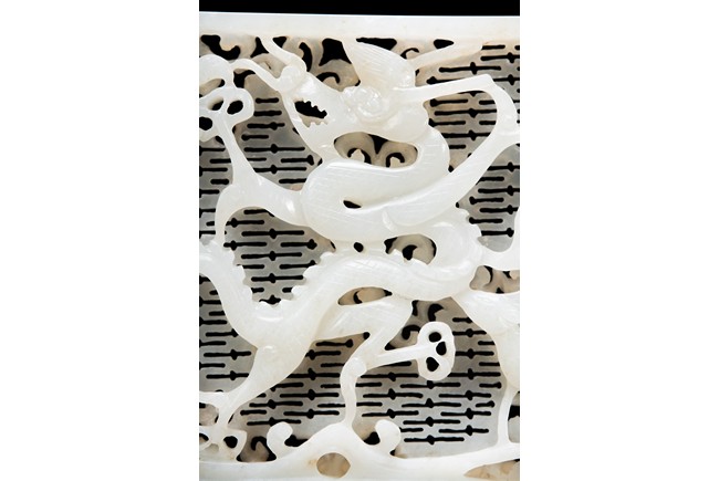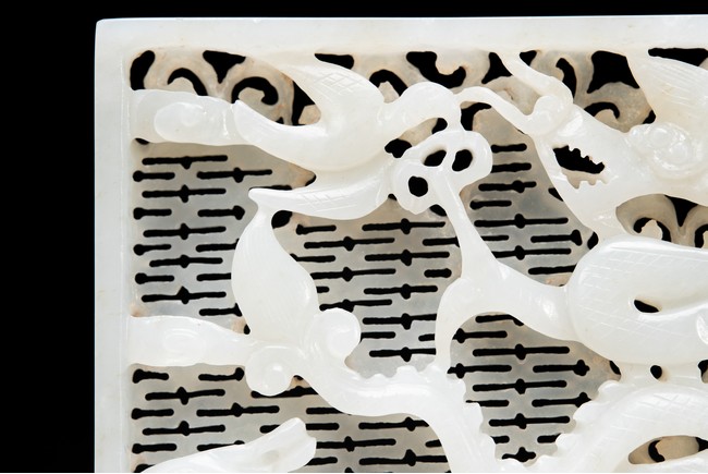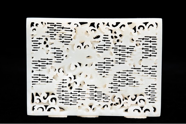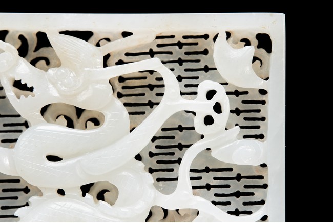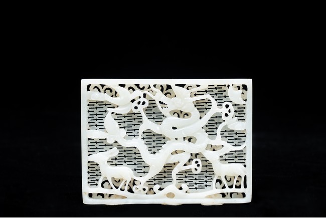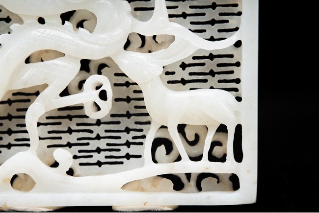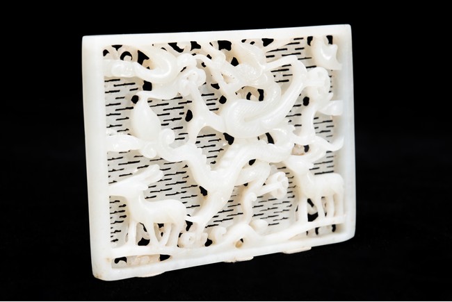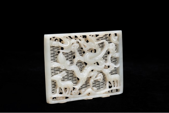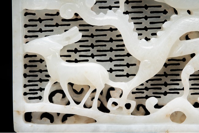 玉帶板多為貴族使用,在唐代至明代比較流行,用者身份等級極高,為中國古代重要腰飾,是身份和等級的重要像徵。玉帶始見於南北朝,一直沿用到明代並發展至頂峰。此帶板以白玉透雕而成,玉質潔白細膩,勻淨無瑕,雕琢雲龍紋,雕工細膩,龍首寬扁,雙圓眼,雲頭鼻,雙觸鬚上伸,張口呲牙,毛髪前衝,雙短角在髪後,龍身婉轉曲折作昇龍狀,身飾斜方格鱗紋。其旁有兩隻鹿,一公一母悠遊其間,整體工藝細緻,極其精湛,立體感強烈。