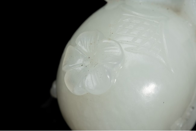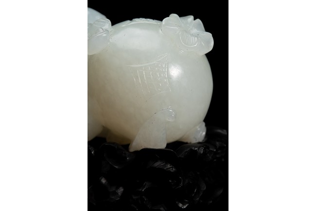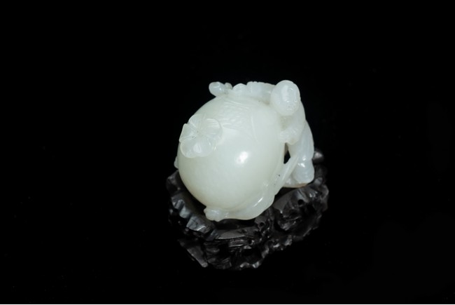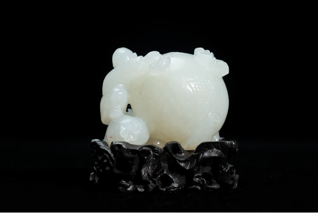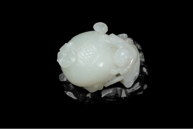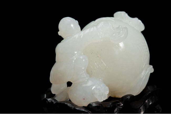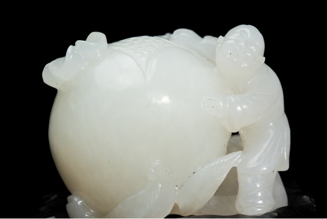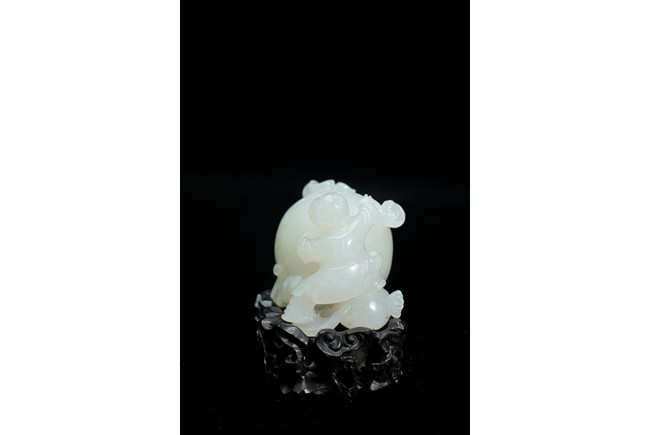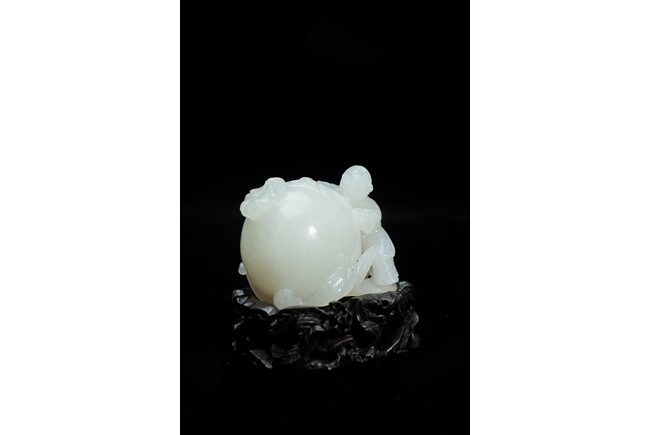 以上等和田白玉圓雕而成,玉質潔白細膩,溫潤含蓄,色澤瑩亮純淨,童子憨厚可愛,表情生動,喜笑開顏。石榴圓潤飽滿,盡顯富態,古人視石榴為吉祥物,稱其“千房同膜,千子如一”,為多子多福的象徵。帶木座。