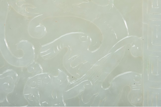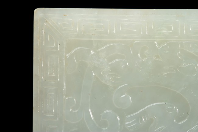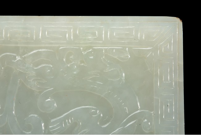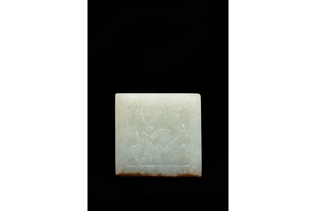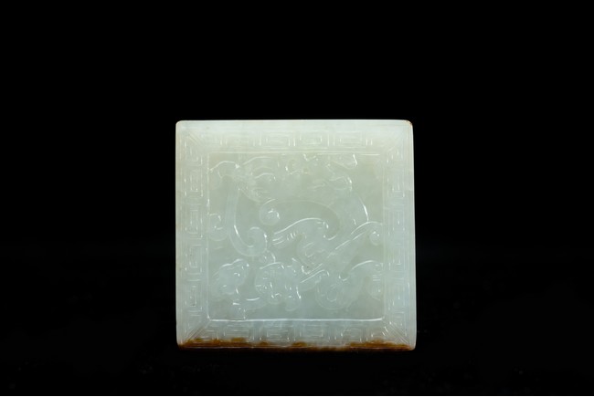 Chinese. Of square form, worked in low relief with a coiled dragon surrounded by key-fret border, the stone is of white tone with russet tone inclusions at the bottom, the back with four pair of holes at the corners. Qing Dynasty period.