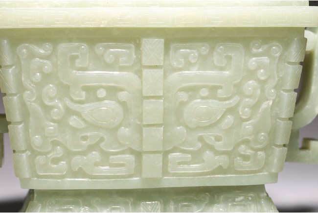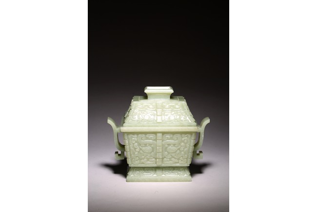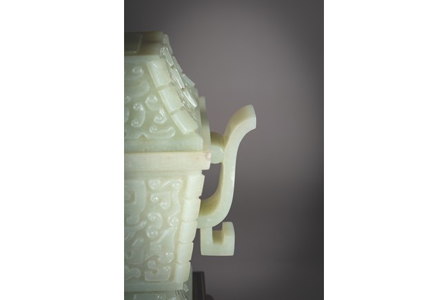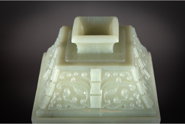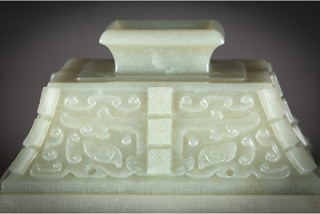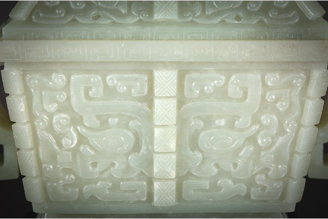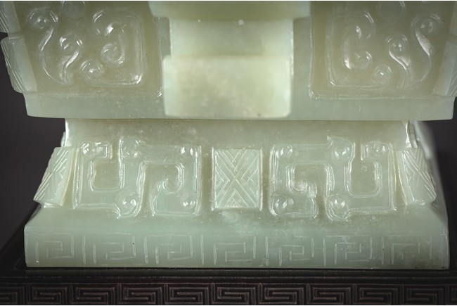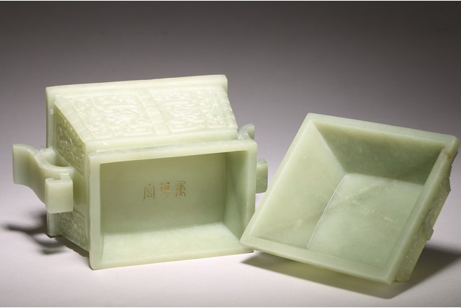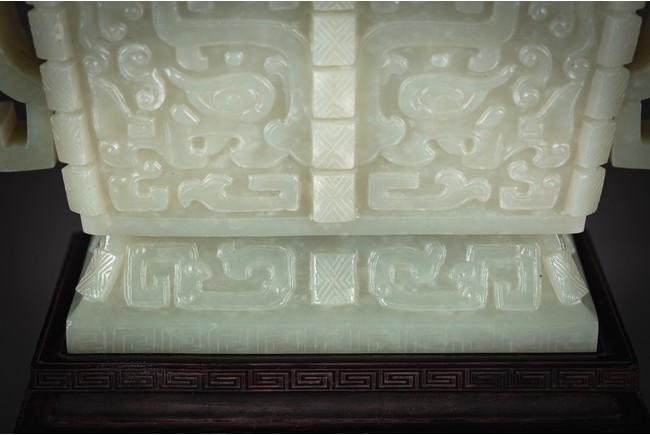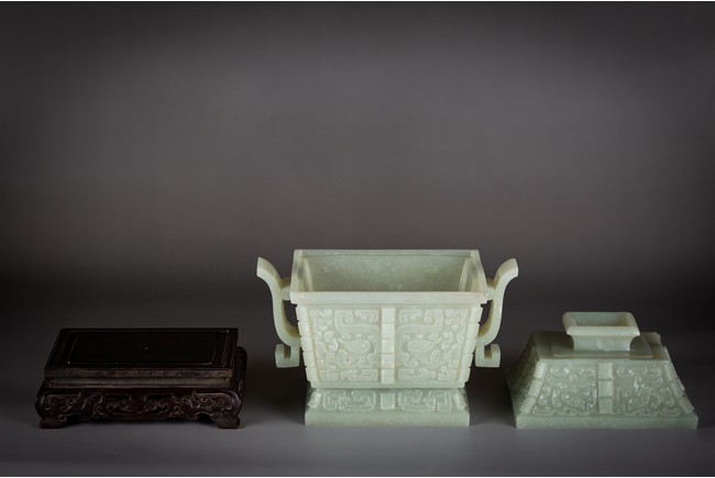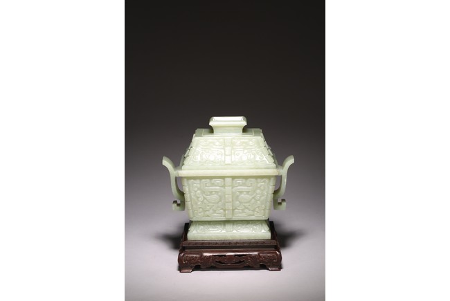 乾隆二十四年,清政府統一回疆,在伊犁設置將軍府,駐紮八旗軍隊,從根本上一舉解決宮廷玉料短缺的問題。自此,中國玉雕迎來前所未有的鼎盛時期,大批精良的和田玉料由新疆運至北京,在宮廷造辦處能工巧匠的鬼斧神工下,幻化成各式美輪美奐的玉雕作品,令後人為之驚嘆。 “和闐玉來夥,巧製頗紛如。漸欲引之古,庶其返以初。”乾隆帝好古,仿古之風盛行一時,但其並不拘泥於單純的形制仿古,而是既追求生拙樸質的趣味,又盡顯活力充沛的創造力。乾隆朝是玉器製作的鼎盛時期,其宮廷玉器精美文雅,遠邁前朝,尤以玉仿青銅製器最為世人推重。本品即為此類工料俱佳的乾隆朝玉雕之代表作。此玉爐以上等和田玉慕古精心雕琢而成,玉料體積較大,且質量上乘,遠觀見寶光盈盈,近觸則溫潤有加。掏膛規整,造型呈四方式,古樸大氣,帶蓋,以子母口連接,合縫嚴密,極見規矩。器身滿刻,淺浮雕對稱“鳳鳥紋”“饕餮紋”,砣工細緻,打磨圓潤,規矩嚴謹,刻線流轉自如,雕琢精細生動,紋飾古樸華麗,層次分明。獸面形像對稱規整而現莊重肅穆之感,雙眼突鼓而作猙獰可怖之勢,形式勾勒輾轉變化,圓折兼施,厚重中蘊含神秘獰厲之氣、華貴秀美之貌。且質地細膩溫潤,包漿渾厚,間融於端莊造型與繁複細密紋飾之間,更顯古雅靜謐之感。底部描金刻有“重華宮”款識,下配有木座,形制規整,雕刻“獸面紋”“如意云紋”“迴紋”。重華宮始建於明代的漢族宮殿建築。雍正十一年,弘曆被封為“和碩寶親王”,住地賜名“樂善堂”。弘曆登基後,此處作為肇祥之地升為宮,名重華。乾隆晚年時,將他做寶親王時期曾經住過的重華宮變成了一個小的博物館。他令人將這裡按照從前自己與皇后富察氏一起居住的房間原貌進行佈置,周圍擺著他未登基時用過的各種生活物品,以及祖父、父親兩代老皇帝賞賜的各種貴重的紀念品。這顯示出他幻想時間可以永遠停止在那個美好的時代,讓他能夠長久地緬懷。蓋爐為清代皇家書房常備之物。乾隆皇帝熟通漢理,精於儒典,乃一代文雅之帝,屋內陳設亦不可少,本品採用和田玉上上之料,取古樸厚重之吉金造型,處處彰顯出古雅樸拙的唯美,構思巧妙,刀工細膩流暢,仿古卻不同於古,具有典型乾隆期仿古玉器的意蘊,於富麗中增添古雅之姿,實為精彩,為不可多得的玉雕珍品。 (參閱2005香港蘇富比拍賣春季拍賣會皇苑雅玩0561號拍品,成交價:HKD:3032000)來源:加拿大溫哥華私人藏家收藏 Provenance: Private collection, Vancouver, Canada