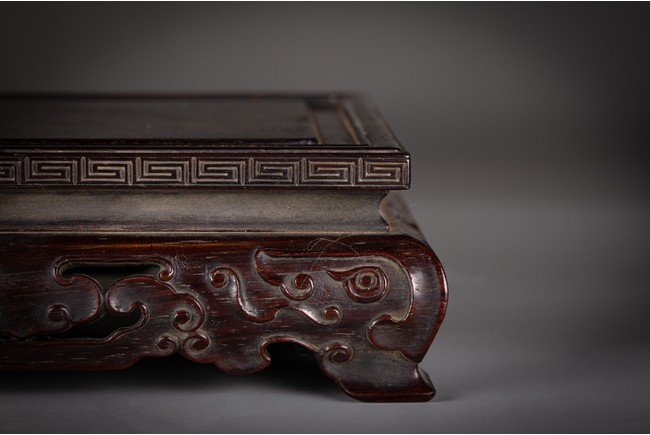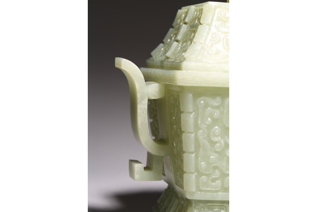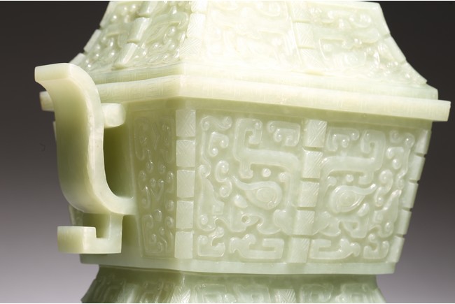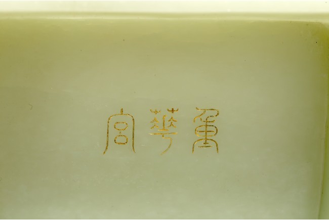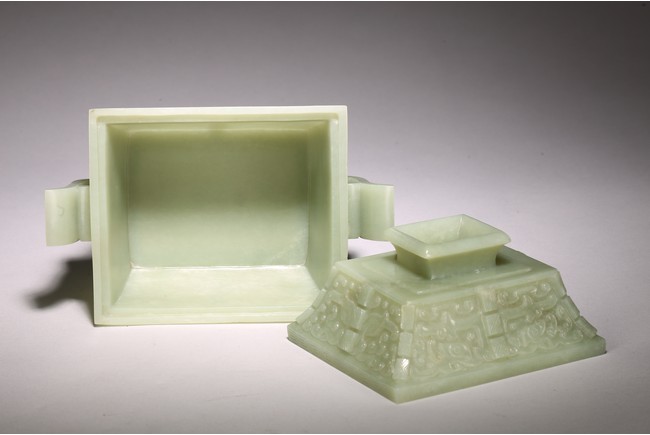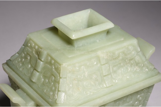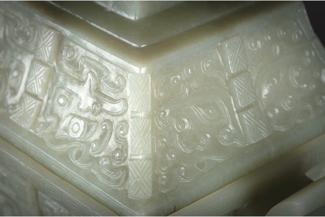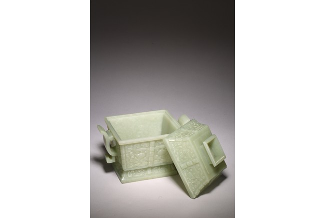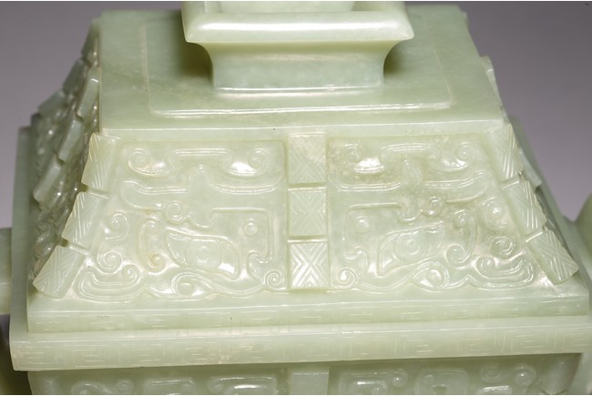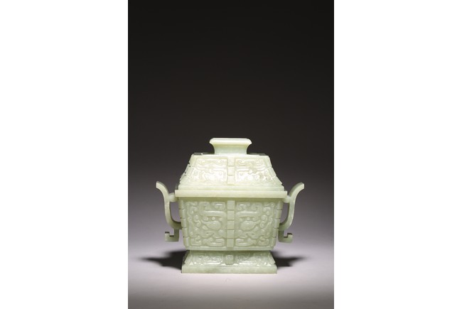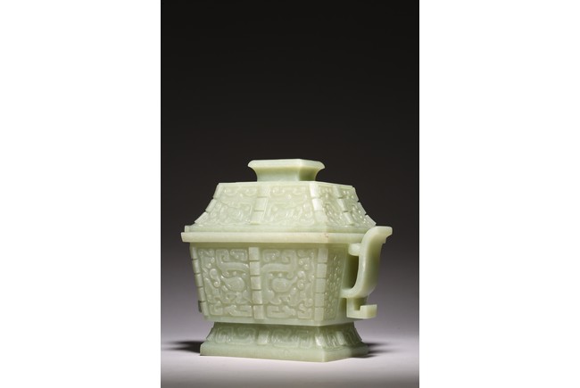 乾隆二十四年,清政府統一回疆,在伊犁設置將軍府,駐紮八旗軍隊,從根本上一舉解決宮廷玉料短缺的問題。自此,中國玉雕迎來前所未有的鼎盛時期,大批精良的和田玉料由新疆運至北京,在宮廷造辦處能工巧匠的鬼斧神工下,幻化成各式美輪美奐的玉雕作品,令後人為之驚嘆。 “和闐玉來夥,巧製頗紛如。漸欲引之古,庶其返以初。”乾隆帝好古,仿古之風盛行一時,但其並不拘泥於單純的形制仿古,而是既追求生拙樸質的趣味,又盡顯活力充沛的創造力。乾隆朝是玉器製作的鼎盛時期,其宮廷玉器精美文雅,遠邁前朝,尤以玉仿青銅製器最為世人推重。本品即為此類工料俱佳的乾隆朝玉雕之代表作。此玉爐以上等和田玉慕古精心雕琢而成,玉料體積較大,且質量上乘,遠觀見寶光盈盈,近觸則溫潤有加。掏膛規整,造型呈四方式,古樸大氣,帶蓋,以子母口連接,合縫嚴密,極見規矩。器身滿刻,淺浮雕對稱“鳳鳥紋”“饕餮紋”,砣工細緻,打磨圓潤,規矩嚴謹,刻線流轉自如,雕琢精細生動,紋飾古樸華麗,層次分明。獸面形像對稱規整而現莊重肅穆之感,雙眼突鼓而作猙獰可怖之勢,形式勾勒輾轉變化,圓折兼施,厚重中蘊含神秘獰厲之氣、華貴秀美之貌。且質地細膩溫潤,包漿渾厚,間融於端莊造型與繁複細密紋飾之間,更顯古雅靜謐之感。底部描金刻有“重華宮”款識,下配有木座,形制規整,雕刻“獸面紋”“如意云紋”“迴紋”。重華宮始建於明代的漢族宮殿建築。雍正十一年,弘曆被封為“和碩寶親王”,住地賜名“樂善堂”。弘曆登基後,此處作為肇祥之地升為宮,名重華。乾隆晚年時,將他做寶親王時期曾經住過的重華宮變成了一個小的博物館。他令人將這裡按照從前自己與皇后富察氏一起居住的房間原貌進行佈置,周圍擺著他未登基時用過的各種生活物品,以及祖父、父親兩代老皇帝賞賜的各種貴重的紀念品。這顯示出他幻想時間可以永遠停止在那個美好的時代,讓他能夠長久地緬懷。蓋爐為清代皇家書房常備之物。乾隆皇帝熟通漢理,精於儒典,乃一代文雅之帝,屋內陳設亦不可少,本品採用和田玉上上之料,取古樸厚重之吉金造型,處處彰顯出古雅樸拙的唯美,構思巧妙,刀工細膩流暢,仿古卻不同於古,具有典型乾隆期仿古玉器的意蘊,於富麗中增添古雅之姿,實為精彩,為不可多得的玉雕珍品。 (參閱2005香港蘇富比拍賣春季拍賣會皇苑雅玩0561號拍品,成交價:HKD:3032000)來源:加拿大溫哥華私人藏家收藏 Provenance: Private collection, Vancouver, Canada