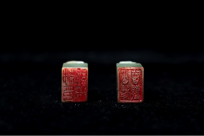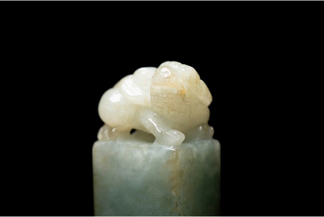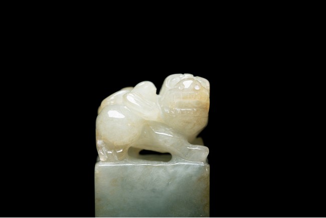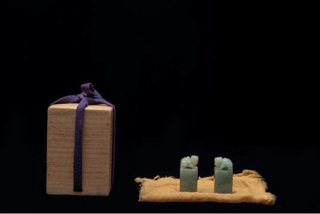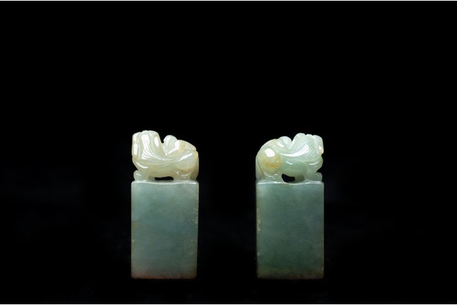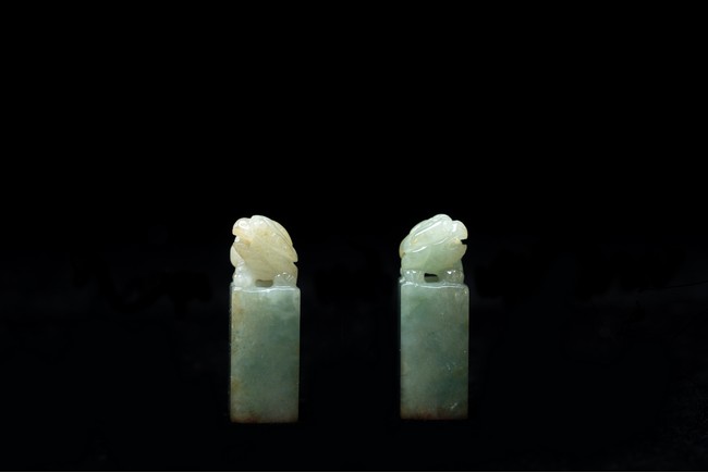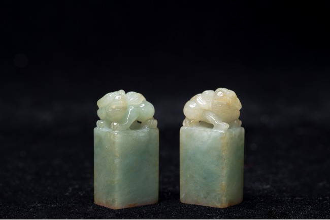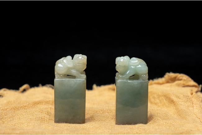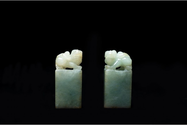 翡翠俗稱硬玉,主要產於緬甸,緬甸翡翠以其充滿生機的青翠與碧綠的特點開始受到皇家重視,迅速走進了王公貴族的審美視野。此對印章濃艷深沉,水頭充足,種水皆佳,色澤通透,玻璃光澤強,盡顯晶瑩剔透之感。呈長方型,雕琢刀法精煉老道,打磨溫潤,印鈕為立體圓雕瑞獅,濃眉圓目,嘴微張露齒,神情敏銳,體態健碩,肌肉強健有力蓄勢待發,一副威嚴兇猛之勢,雕刻極為生動。印文:“林則徐印”“少穆曾觀”。配木盒(林則徐:字元撫,又字少穆、石麟,中國清代後期政治家、文學家、思想家,民族英雄。歷官翰林編修、江蘇按察使、東河總督、江蘇巡撫、湖廣總督等職。道光十九年以欽差大臣赴廣東禁煙時,派人明察暗訪,強迫外國鴉片商人交出鴉片,並將沒收鴉片於虎門銷毀。對晚清的洋務運動乃至日本的明治維新都具有啟發作用。)來源: 波士頓私人收藏 Provenance: Private collection, Boston, Massachusetts.