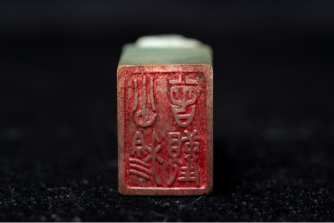 Chinese. Of rectangular form, the top carved with a buddhist lion cub, the seal face carved with four characters each. Late Qing Dynasty period.