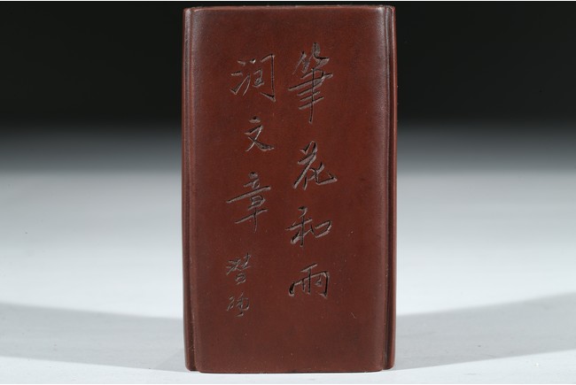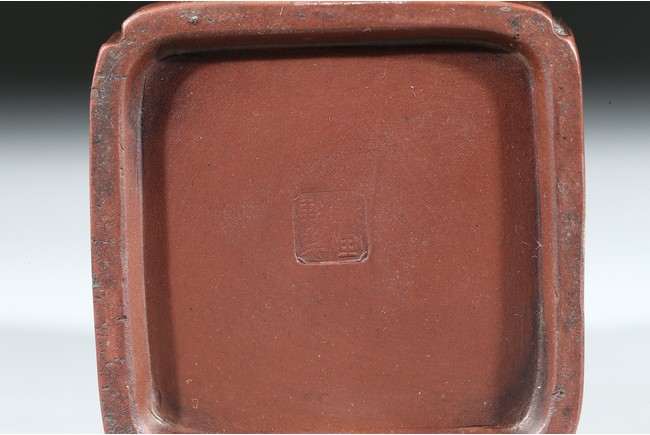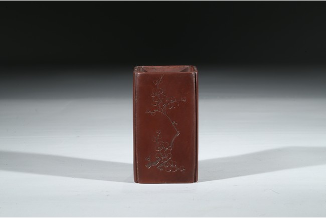A YIXING 'PRUNUS' SQUARE BRUSHPOT 民國 紫砂梅花紋方筆筒