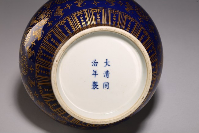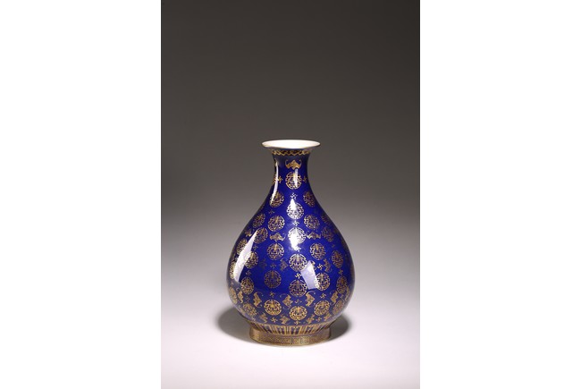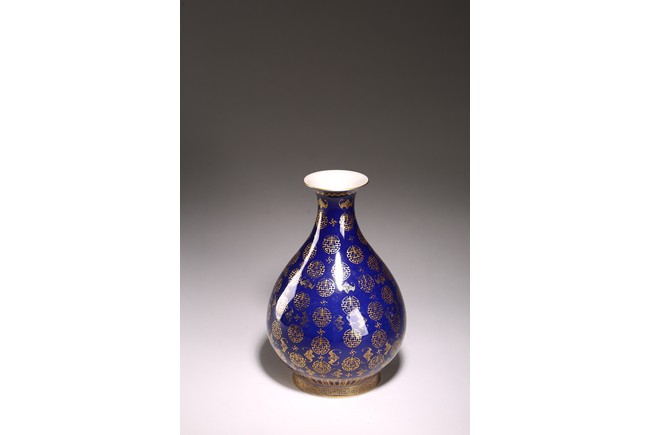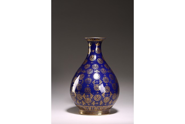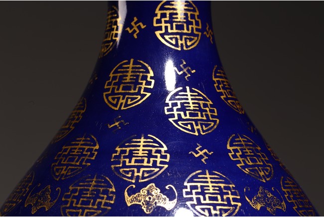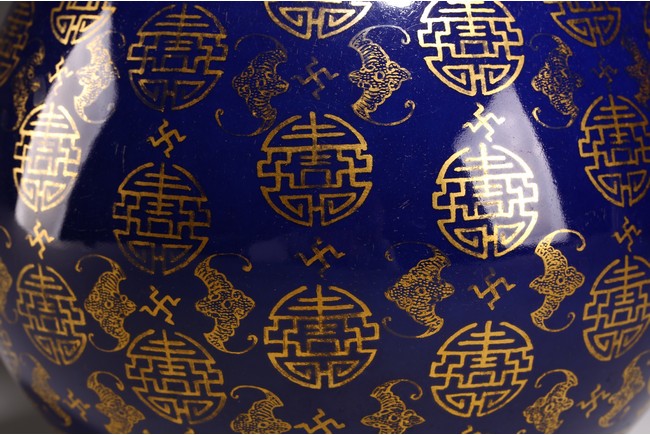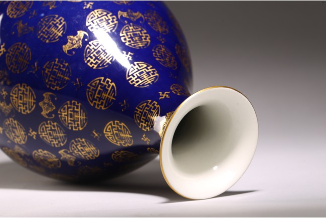本品秀巧典雅, 曲線雋美多姿, 撇口, 束頸, 下腹略垂鼓, 下承圈足 。通體施祭藍釉, 色 澤亮麗, 釉質滋潤, 上描金繪紋樣, 金彩保存艷麗, 品相俱佳, 口沿繪“如意云紋”, 主題紋飾為”福壽紋“, 足部繪“蓮瓣紋”“迴紋” 。整器祭藍莊重靜穆, 深沉明亮, 描金清晰 閃耀, 交錯相映, 透出皇家富貴之氣,是一件難得的陳設佳器 。 “大清同治年制”青花款識。