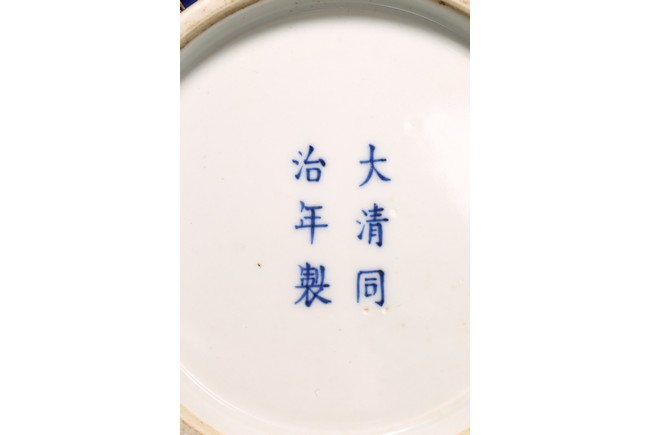 Chinese. Of pear-Shaped with flaring neck, all supported on a slightly splayed foot, the exterior finely painted with repetitive motifs of auspicious bats flanking 'shou' medallions, all between upright lappets around the foot and ruyi heads around the mouth, the base inscribed with six character Tongzhi mark. Late Qing Dynasty period.