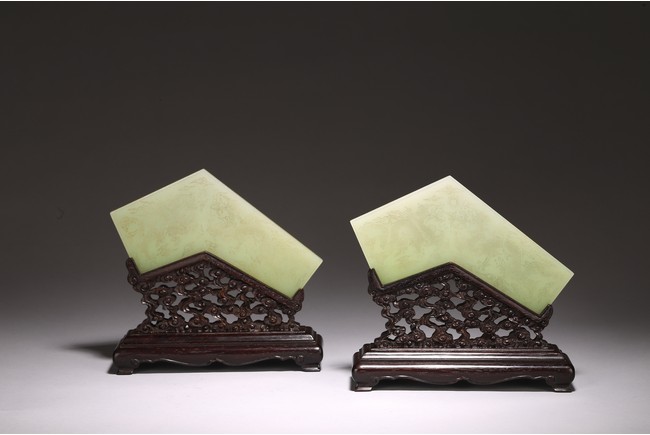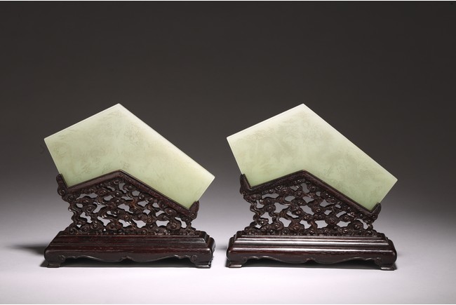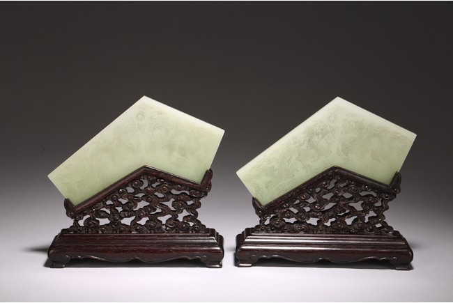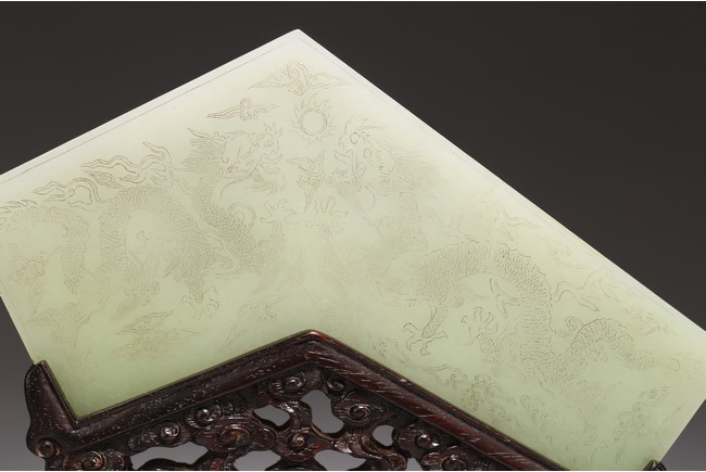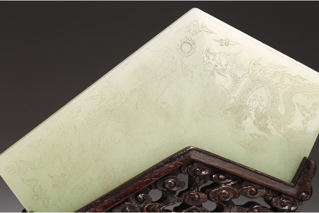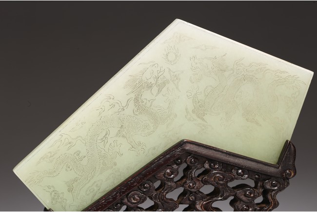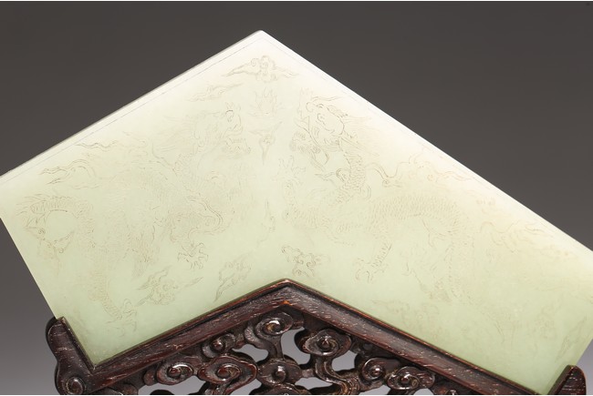Chinese. Of asymmetrical chevron form with a squared end angled to the longer tapered side, finely incised on front and back with a pair of ferocious dragons chasing flaming pearl, all supported on reticulated zitan wood stands. Qing Dynasty period.