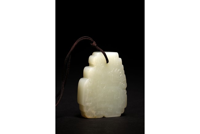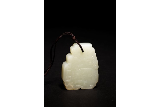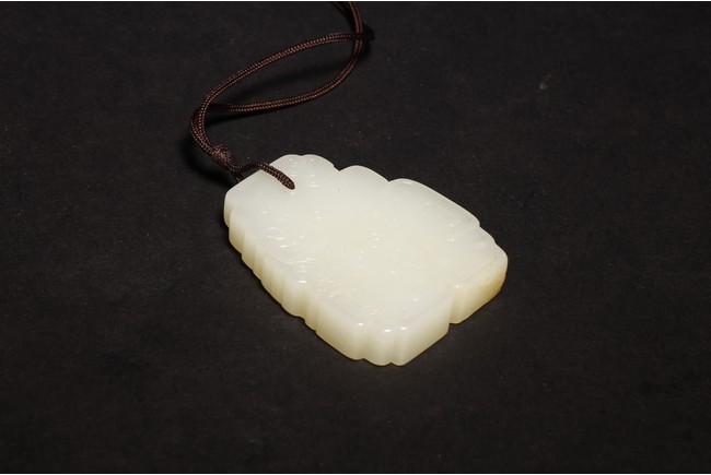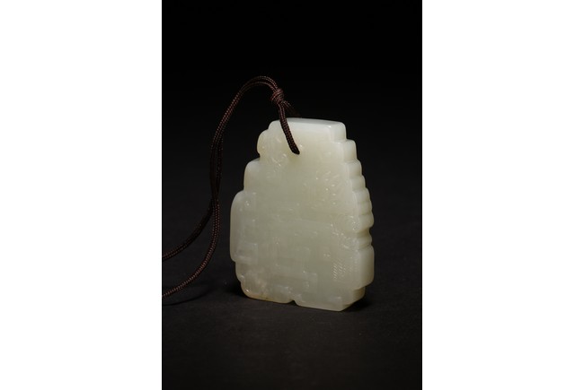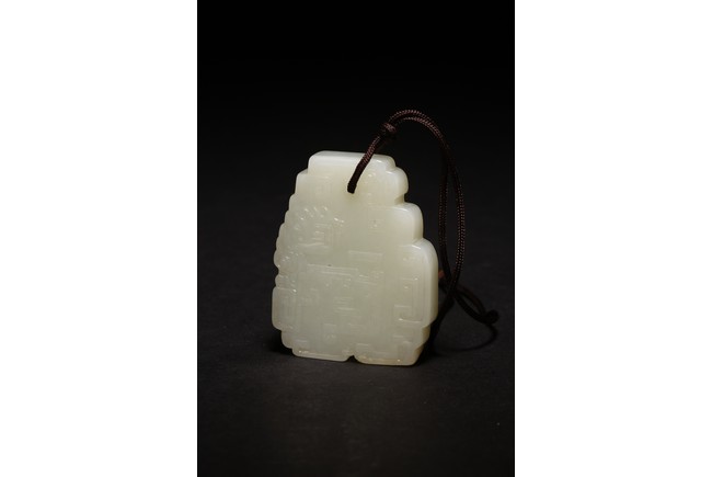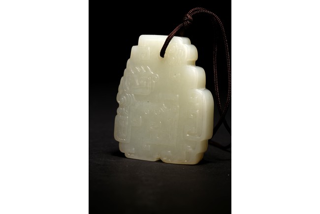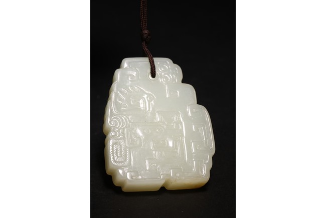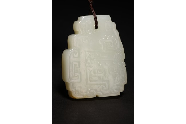 Chinese. Carved in low relief in style of archaistic pattern on ancient bronze to depict a stylized phoenix with angular scrolls, the stone is of polished even white tone. Qing Dynasty period.