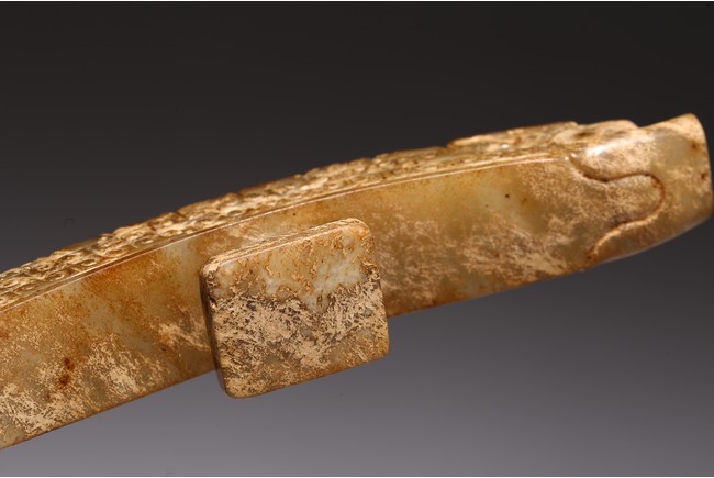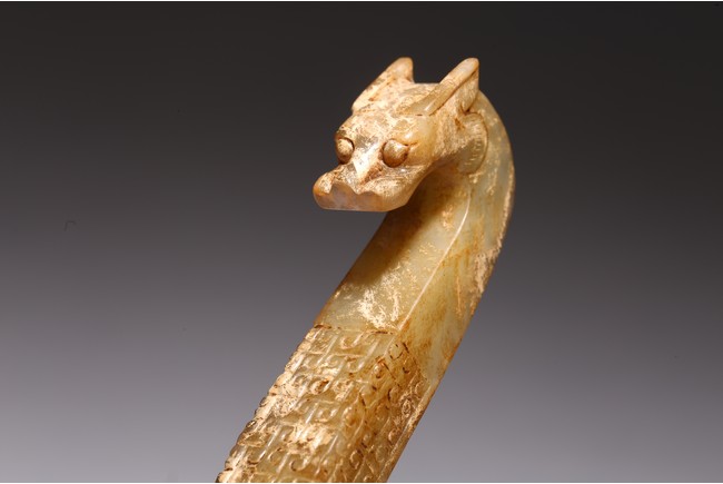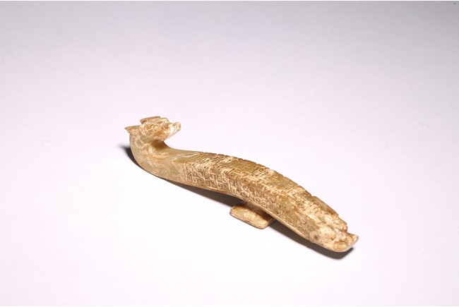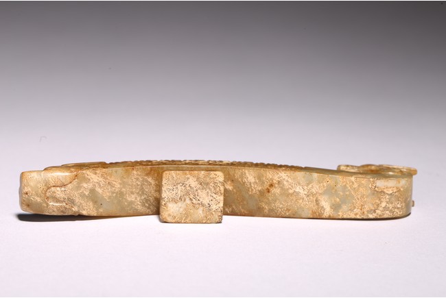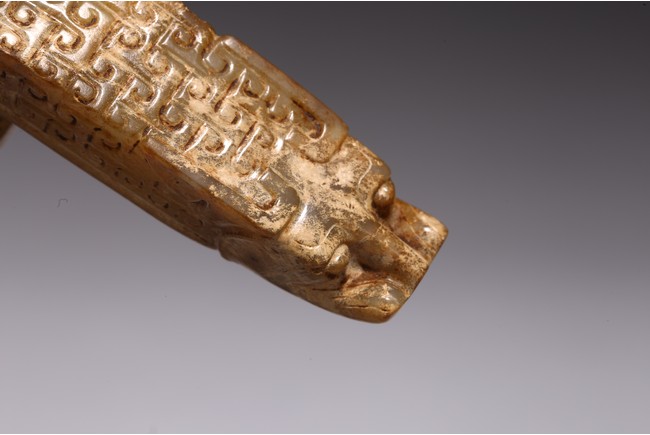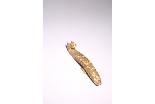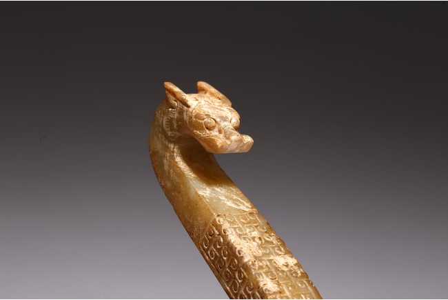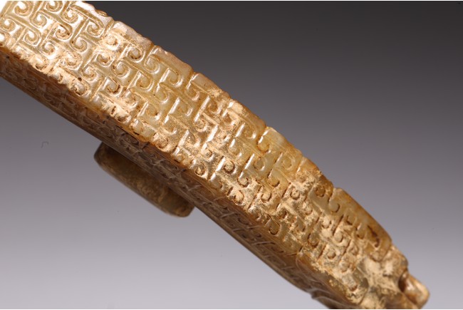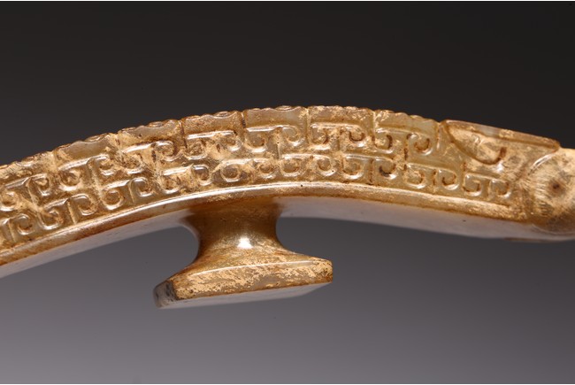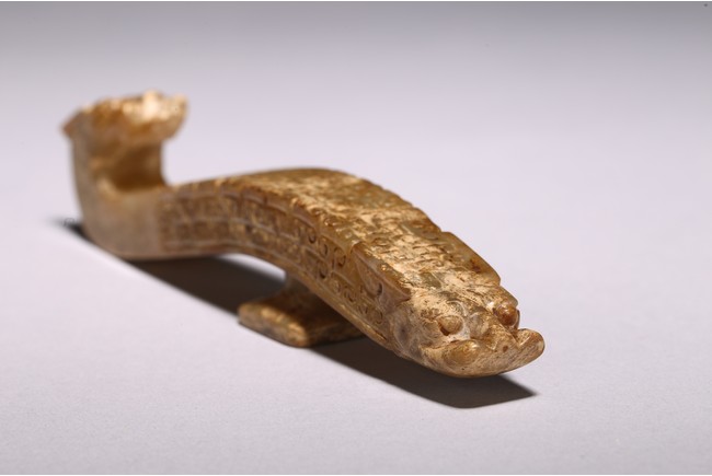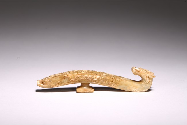Chinese. Carved with a dragon-head terminal on each end, the arched stem with a circular knob on the underside, the body carved with dense scrolled pattern. Warring State period or later.