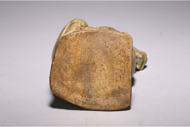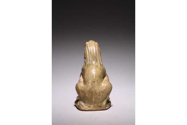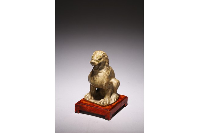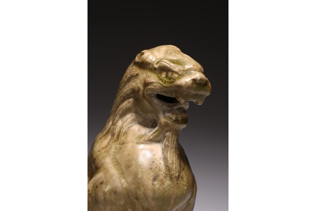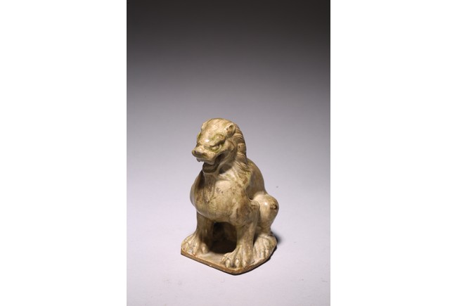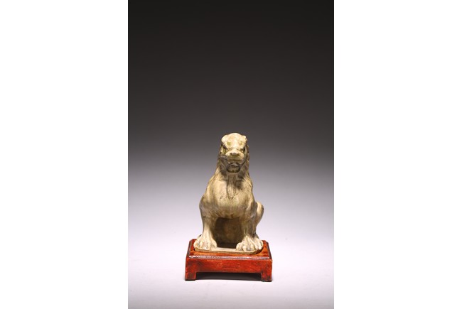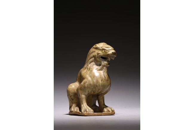 Chinese. The lion modelled seated on square square panel with ferocious expressions detailed with flared nostrils eyes and jaws opened, overall covered in olive green glaze, wood stand. Tang Dynasty period.