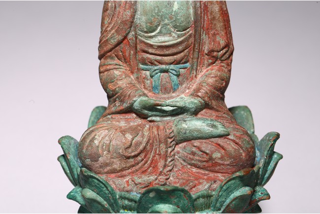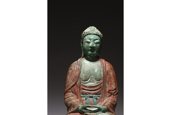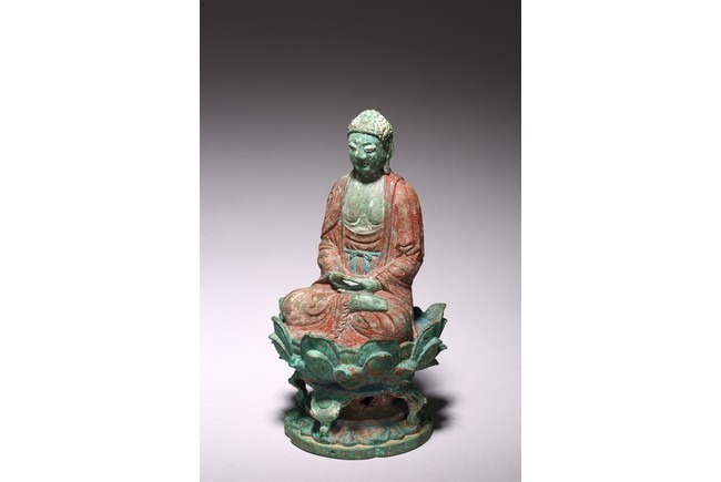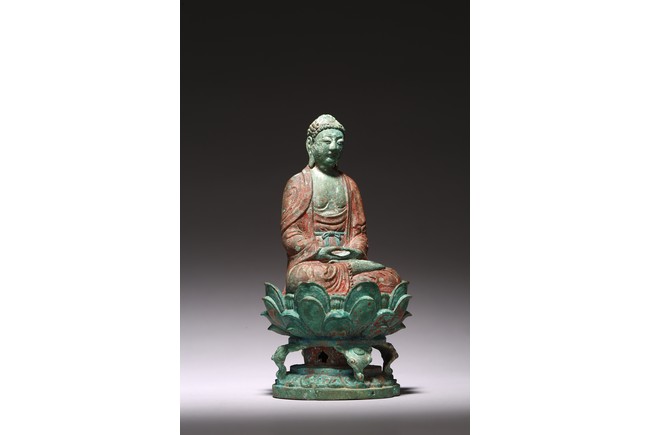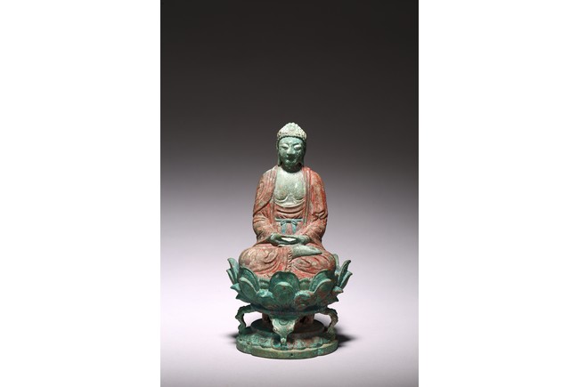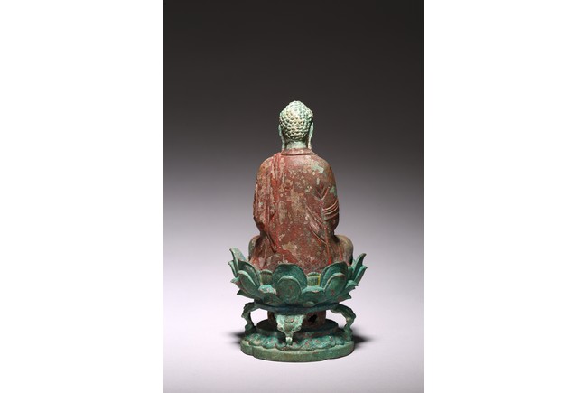 Chinese. Depicted seated in a posture of meditation with legs in padmasana atop a powerfully cast throne decorated with two rows of overlapping petals, wearing a diaphanous robe drapes over his arms and gather at his feet, the robe painted with red pigments. Liao Dynasty period.