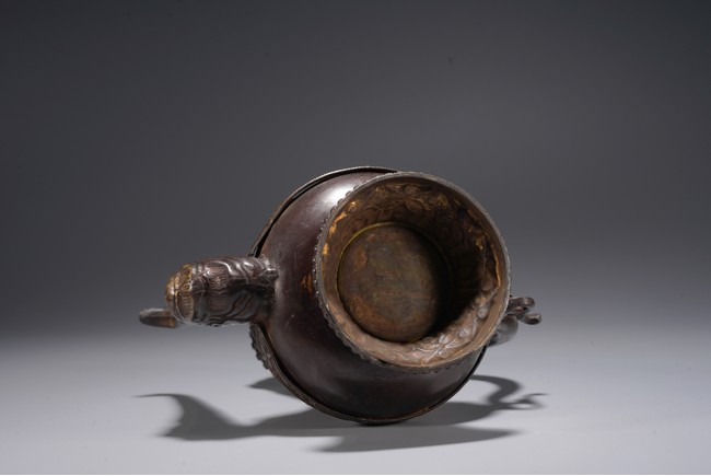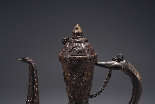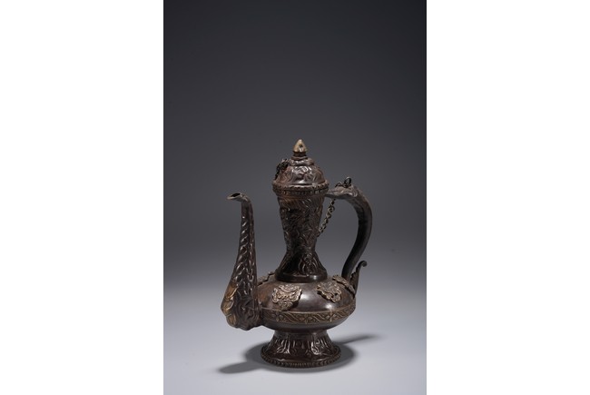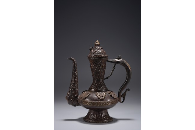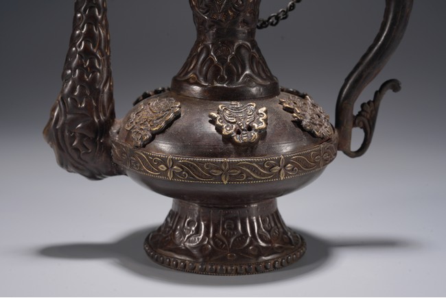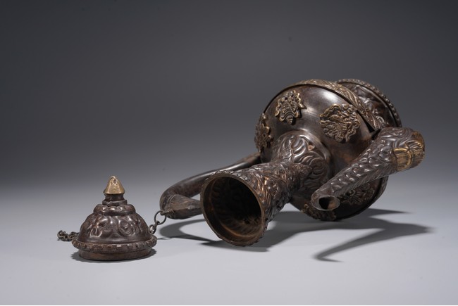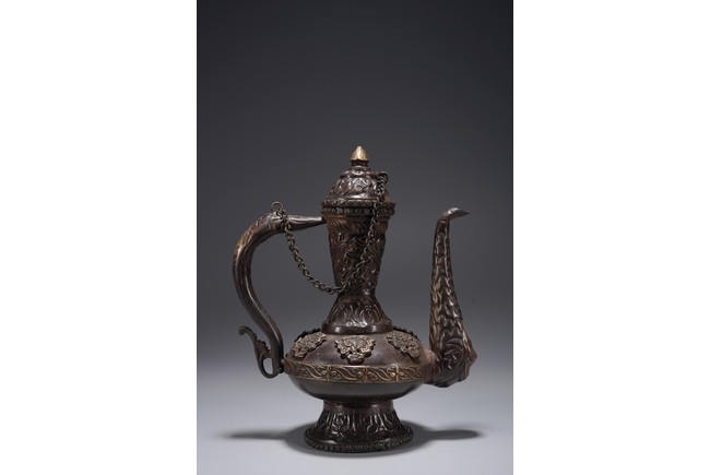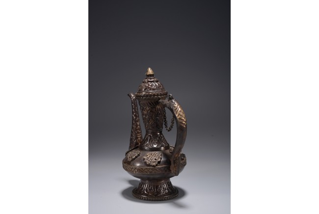 The body decorated with the eight buddhist emblems in relief, the waisted neck worked with auspicious motifs, the handle linked by chain to the domed cover surmounted with a finial. Qing Dynasty period.