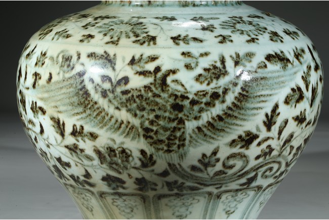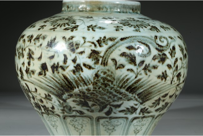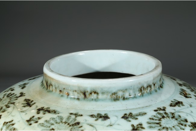 本品紋飾層次繁密,造型壯碩雄偉,圓口斂肩豐腹,通身內外施釉,通體白釉如玉,釉色白中帶青,積釉處呈現鴨蛋青色澤,有部分釉漿罩掛於胎上,流淌自然,釉下繪青花紋飾,從上到下分繪纏枝菊瓣紋、纏枝牡丹紋,佈局繁密而有序,筆意酣暢灑脫。所繪牡丹、菊瓣飽滿碩大,仰俯有致,風姿典雅,青花明亮妍翠,時代工藝特徵鮮明。