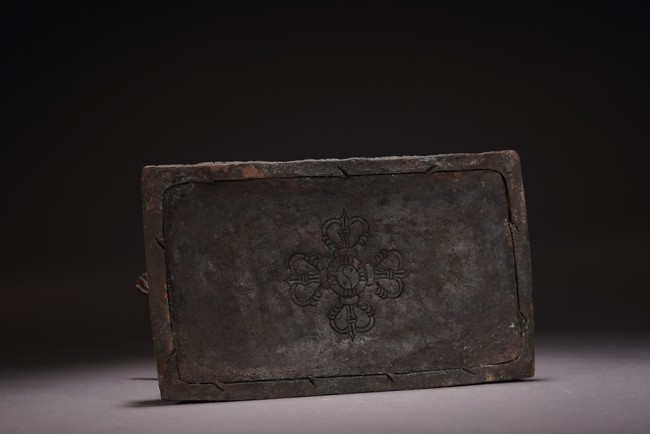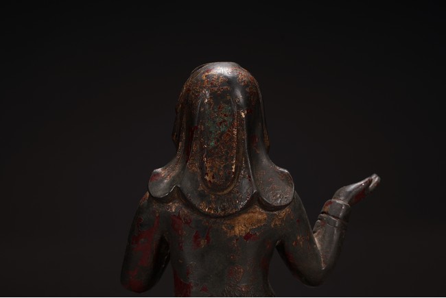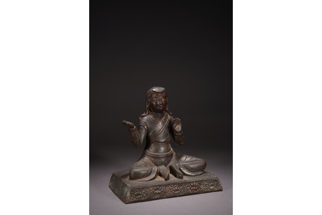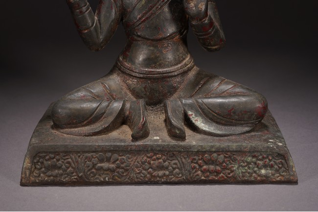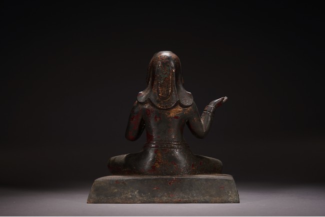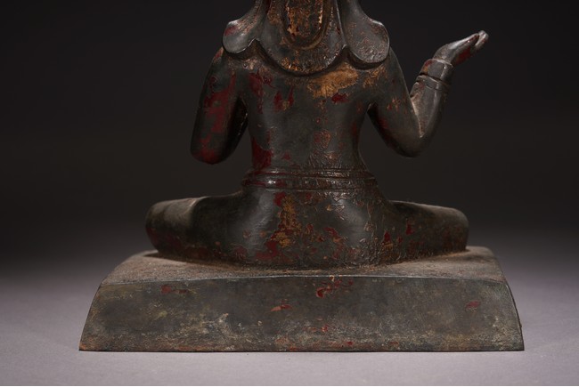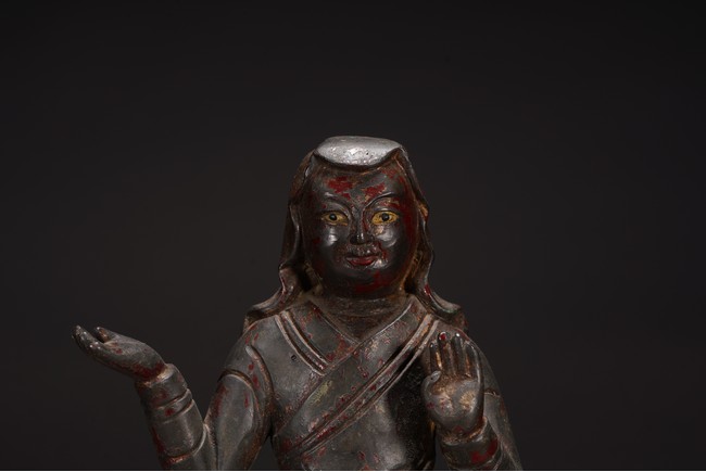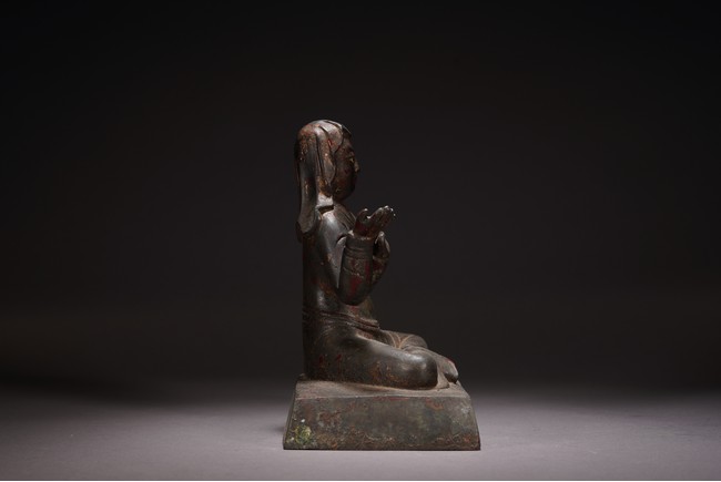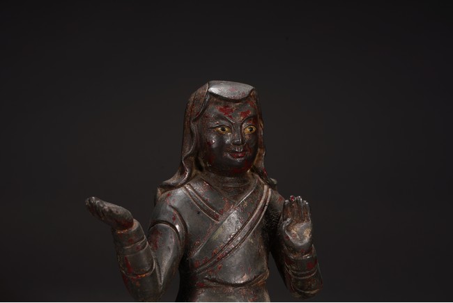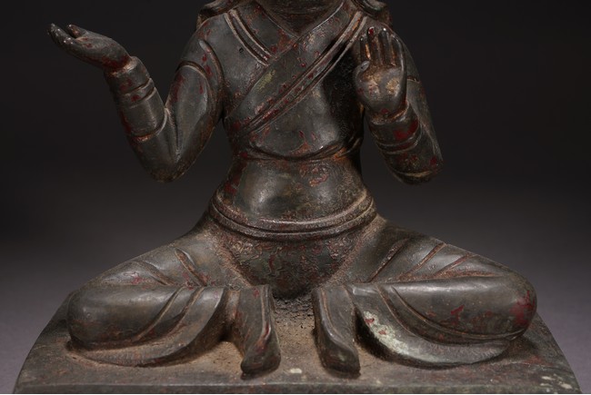 The buddhist figure is shown seated on cushion, right hand in karana mudra , wearing monastic robe, stern face with frown, the base sealed, with traces of lacquered pigment. Qing Dynasty period.