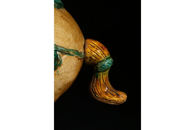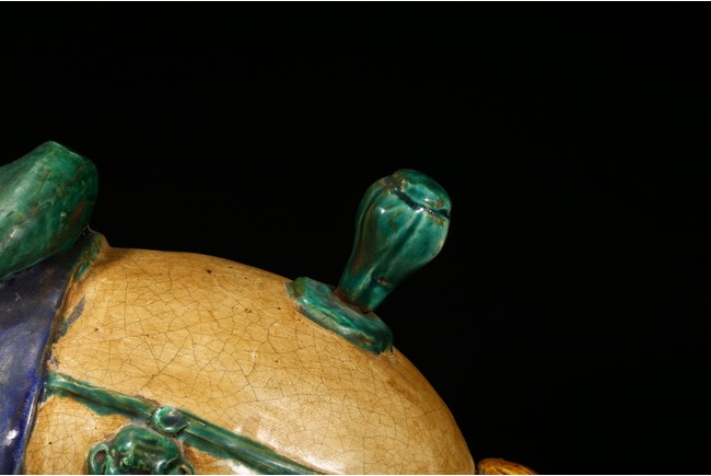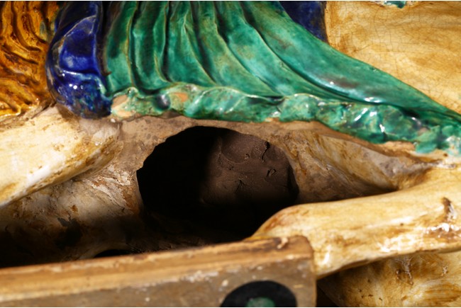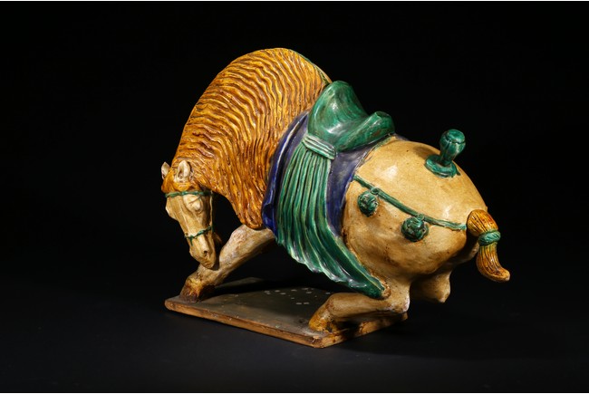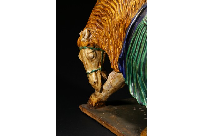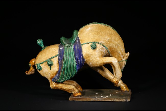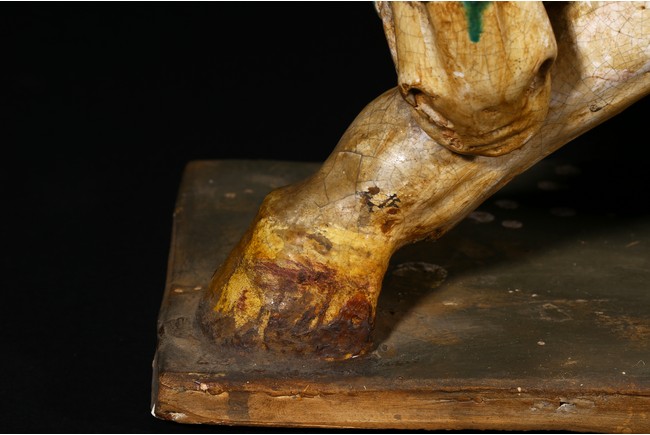 The horse shown standing on a rectangular bisque base, in a prancing pose with its right foreleg raised and its head bowed.