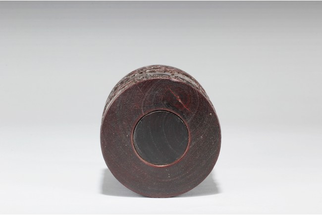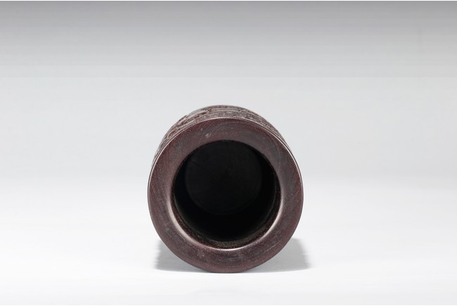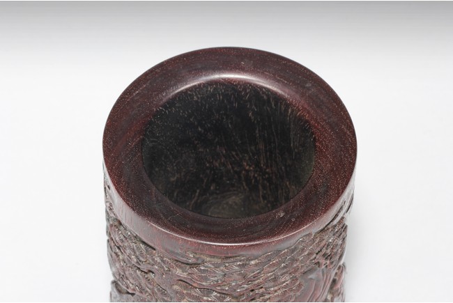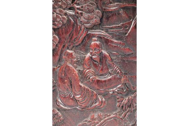 Of cylindrical form, the brush pot low relief carved with two seated elders conversing in forest setting, and two cranes standing in river bank, with pine trees, mountains, and rockworks in the backdrop.