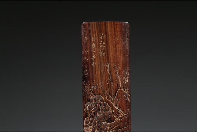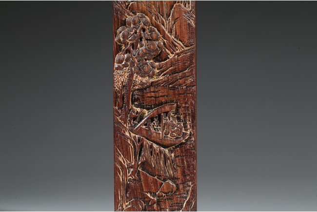 Of rectangular form, one side carved in relief with figures on a boat in a river setting, with cliff and mountains in the background, top left with inscription. Qing Dynasty period.