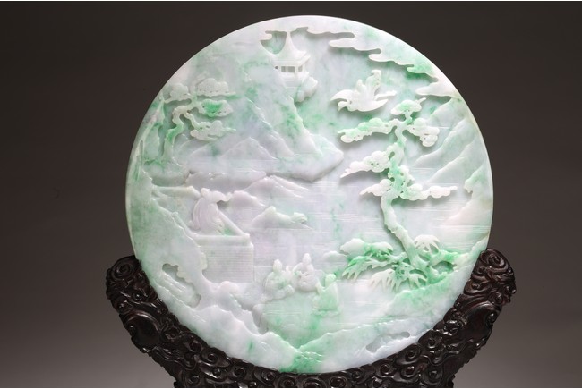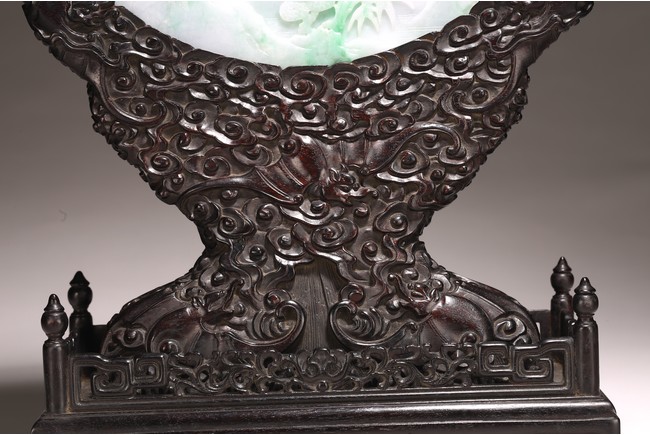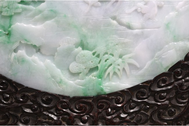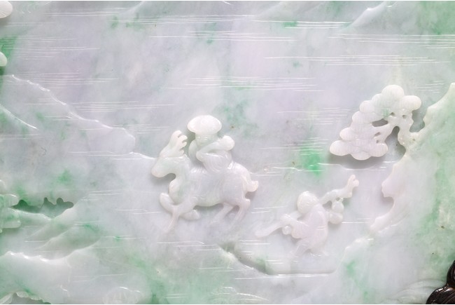 The jadeite panel carved to one side with three scholars gathering and sitting under a large pine tree growing from rocky outcrop, with pavilions and mountains to the near and far background; the reverse carved with a elderly man riding on deer followed by a young attendant, the stone is of mottled apple green and white tone, all supported on a delicately carved zitan stand. Qing Dynasty period.