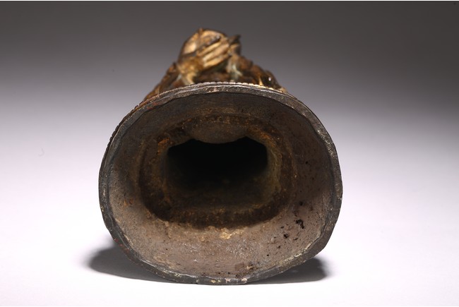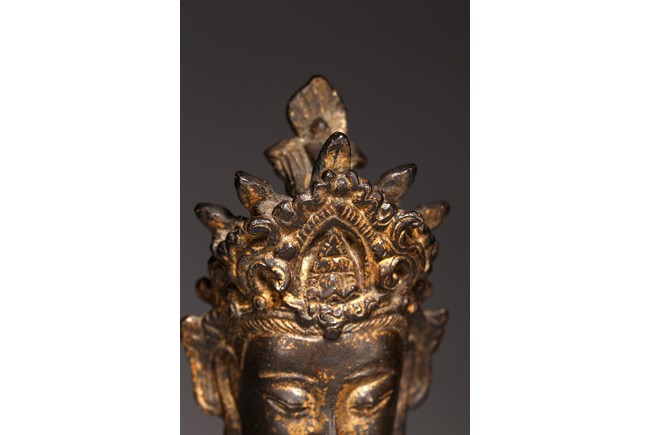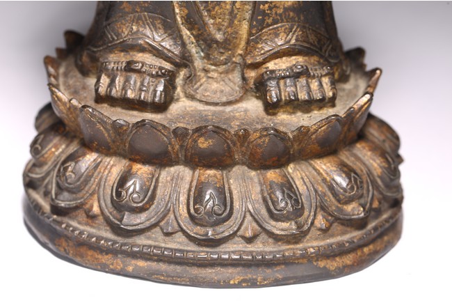 觀音方面闊額,修眉細目,寂靜慈祥,頭戴寶冠,繒帶束髮,頂嚴化佛。袒上身,披帛帶,下著裙裳,佩飾瓔珞釧鐲,安立雙層仰覆蓮瓣之上。