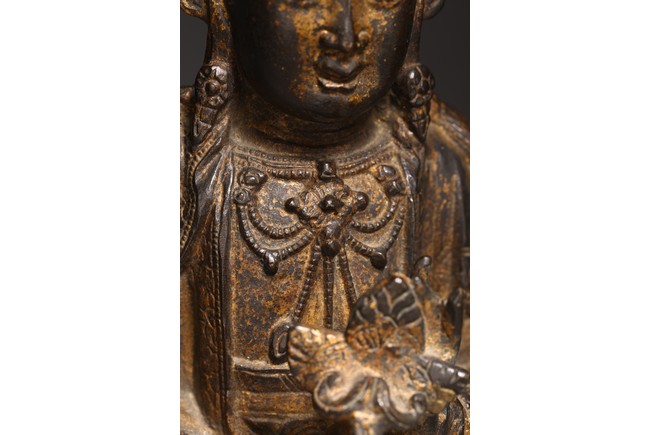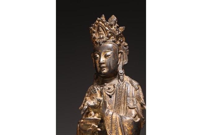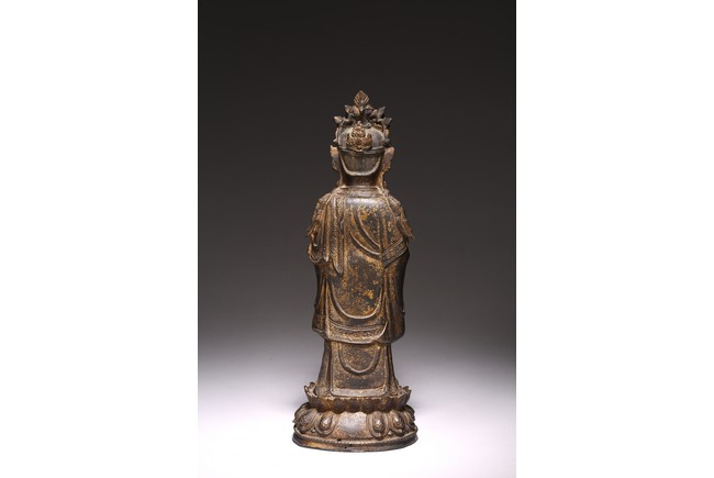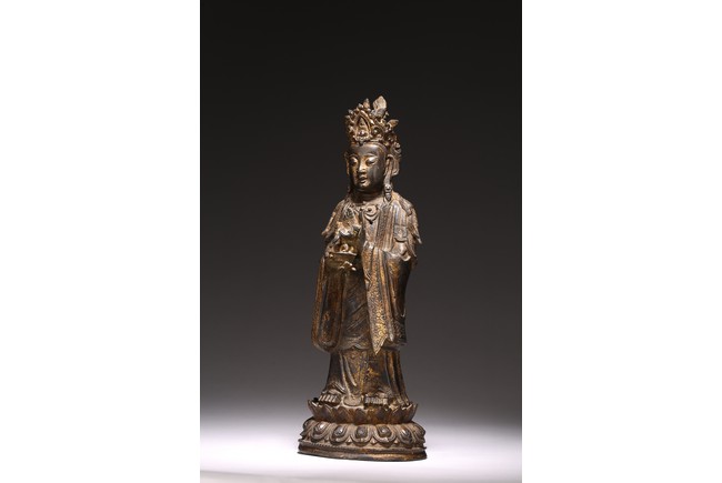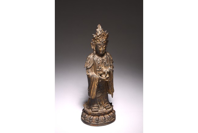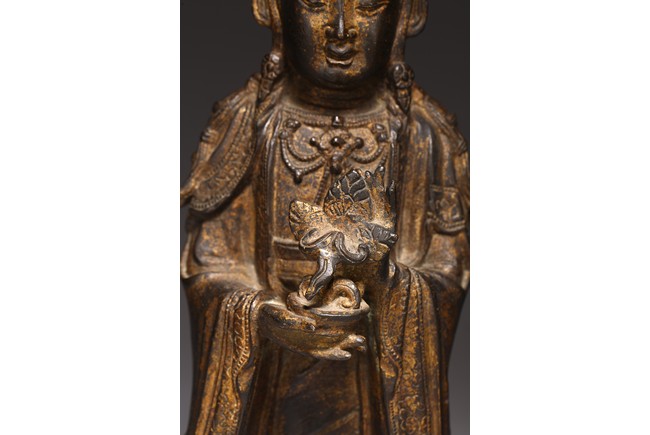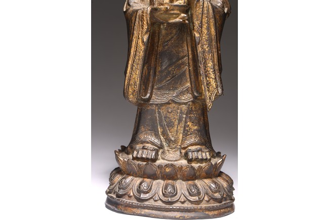 Chinese. The figure standing on a lotus base with her hands holding a bowl, wearing long flowing robes and a pendant necklace, her face with a peaceful downcast expression and her hair tied up behind a crown, with traces of gilt paint overall. Ming Dynasty period.