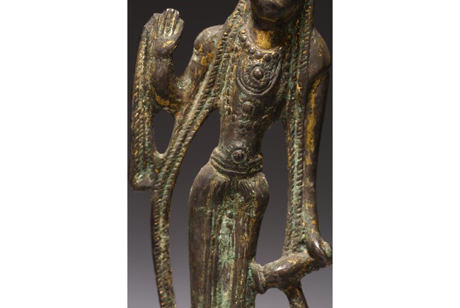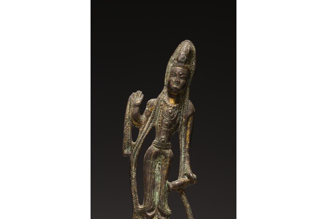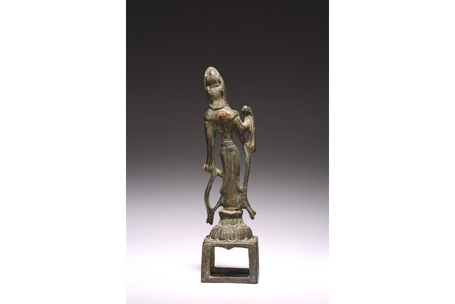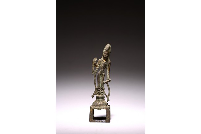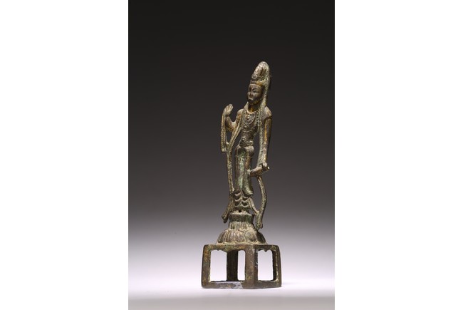 Chinese. Standing on a lotus base atop an integral stand, the sinuous body dressed in a dhoti clinging to the legs, right hand raised with palm facing forward, left hand holding a cup, the face with serene expression. Northern Wei Dynasty period.