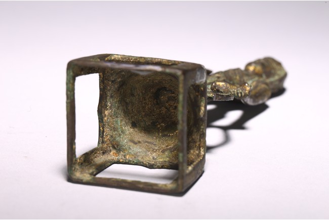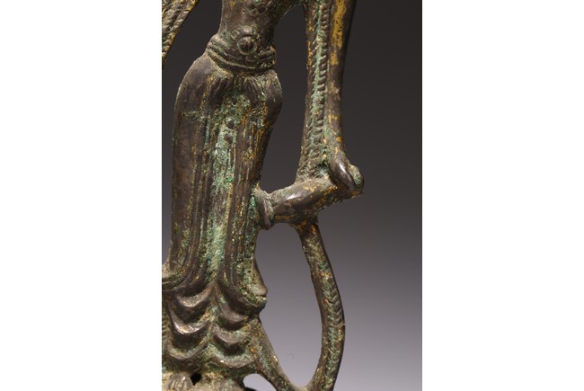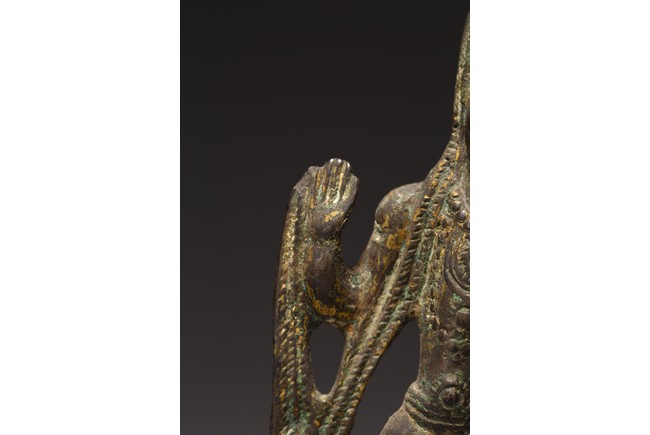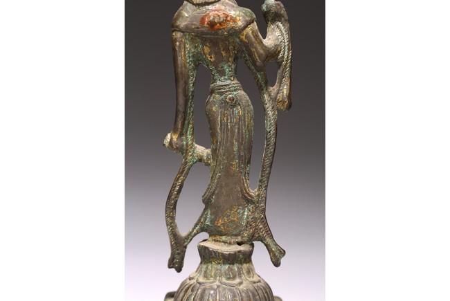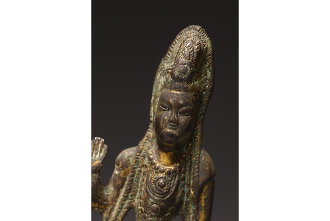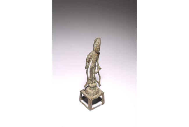 銅鎏金製成,鎏金因年代久遠漸漸脫落,觀音高束髮,戴巾冠,面容圓潤,眉如彎月,雙目緊閉,鼻樑尖挺,唇線分明,姿容端莊,左手作“無畏印”,右手持淨水瓶,身材纖細,安立蓮座之上。