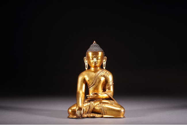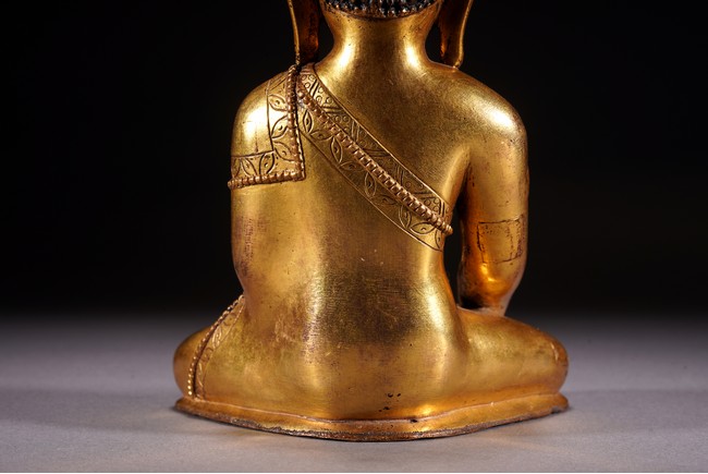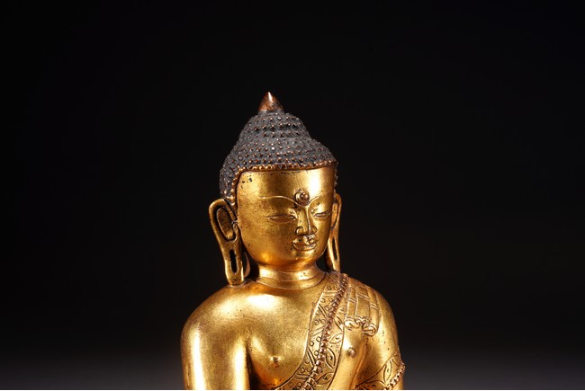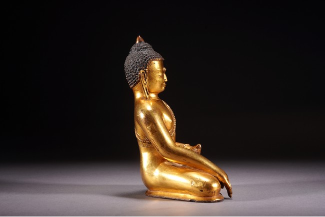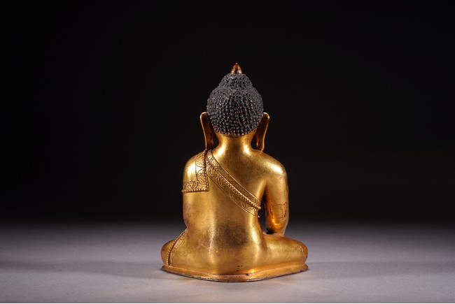 Ming Dynasty period. Seated in vajraparyankasana the right hand extended in bhumisparsha mudra and the left in dhyanamudra, wearing a sanghati gathered on one shoulder, the serene face with a meditative expression.