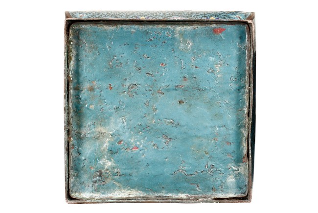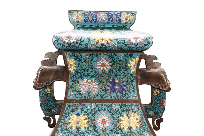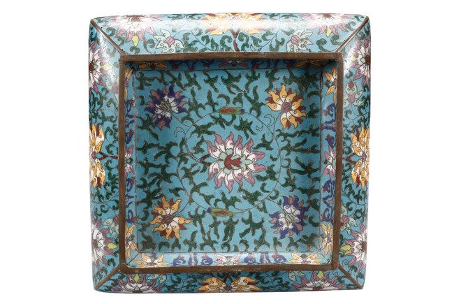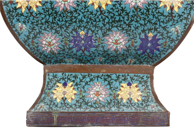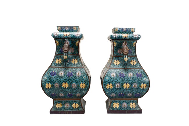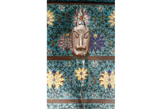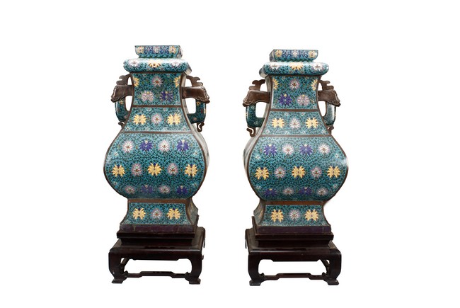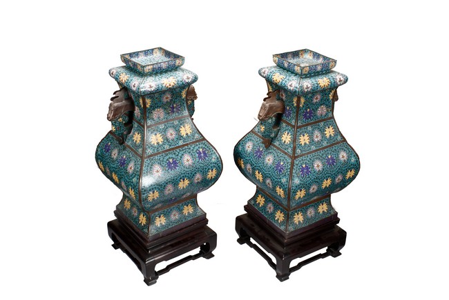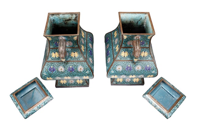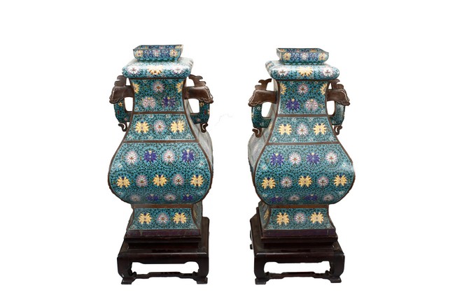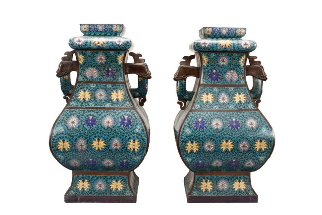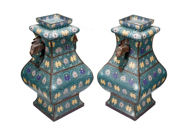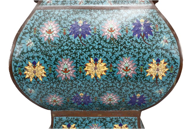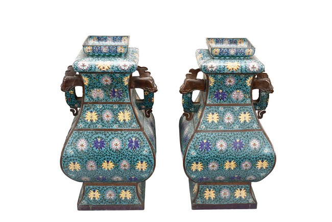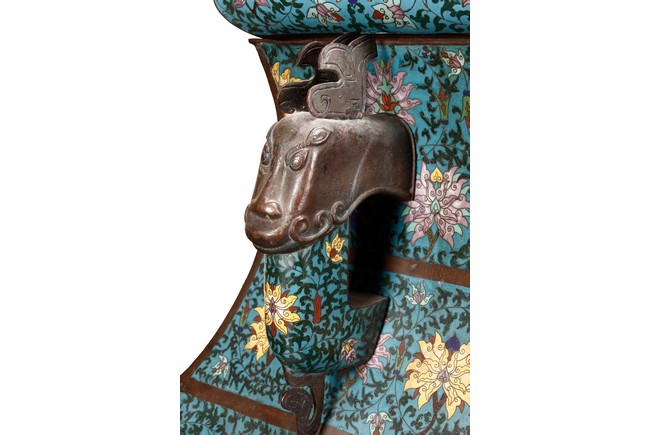 Of rectangular section, the pear-shaped body rises from a truncated pyramidal foot to waisted neck, flanked by a pair of finely cast mythical-beast handles, the body is elaborately decorated with intricate stylized foliate scrolls and bands of lotus. Late Qing Dynasty period.