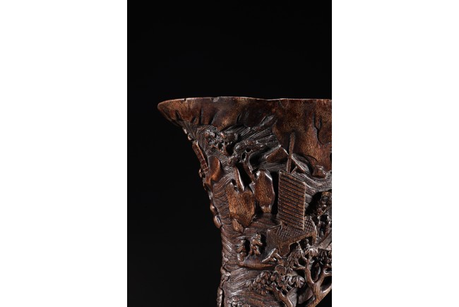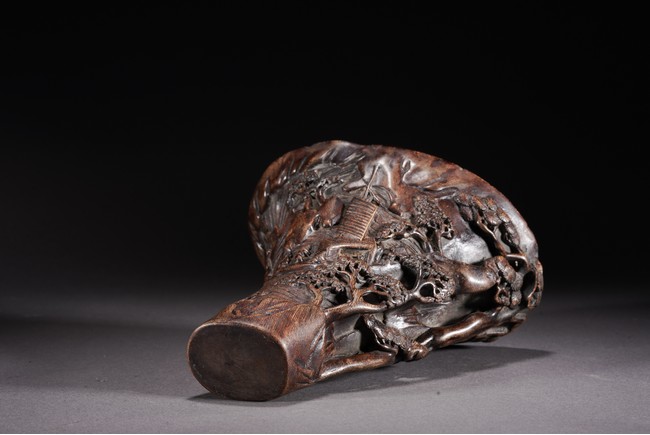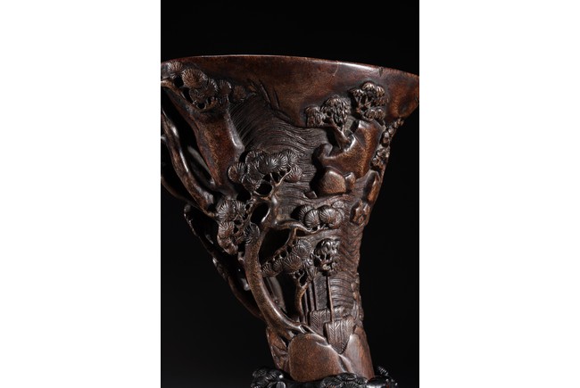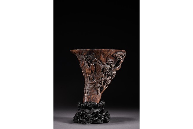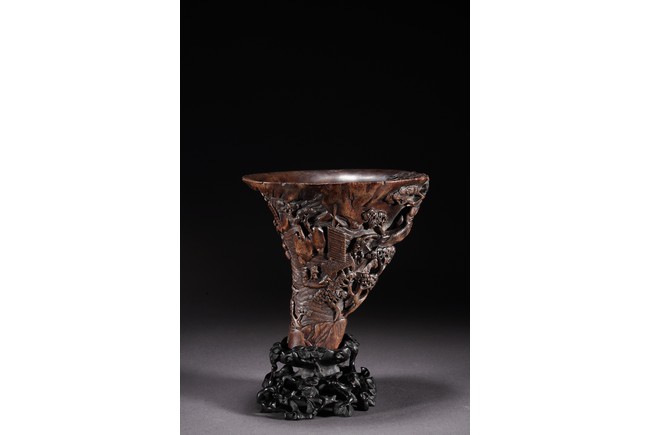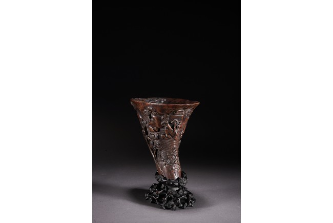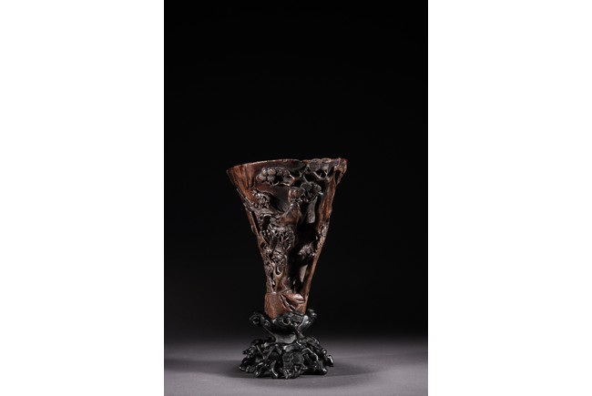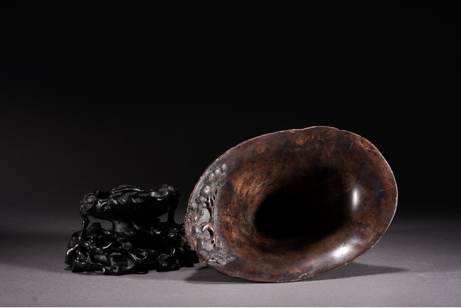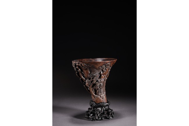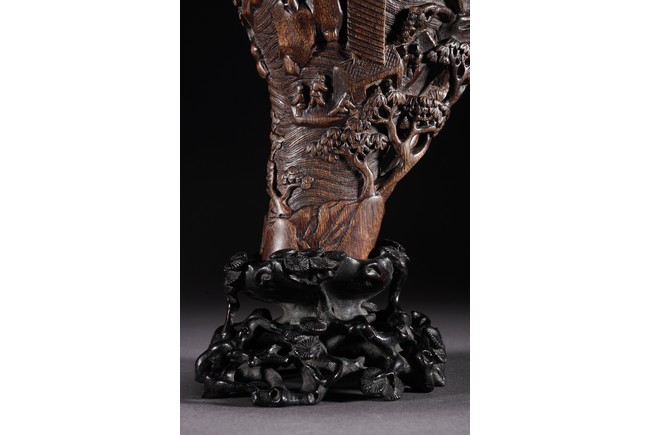 Chinese. The body of the cup carved around in relief with river, boat, and pine trees, the wood is of russet tone with aroma, fitted on a carved wood stand. Qing Dynasty period.