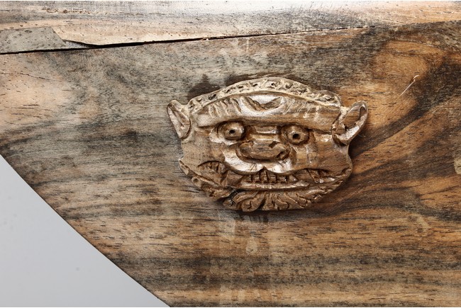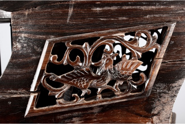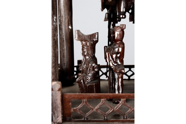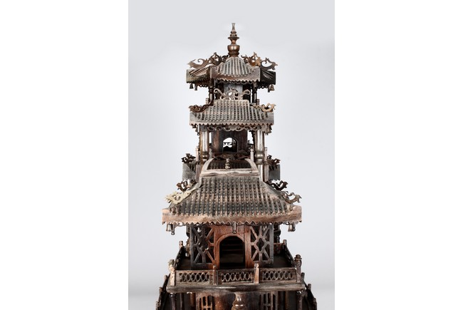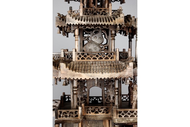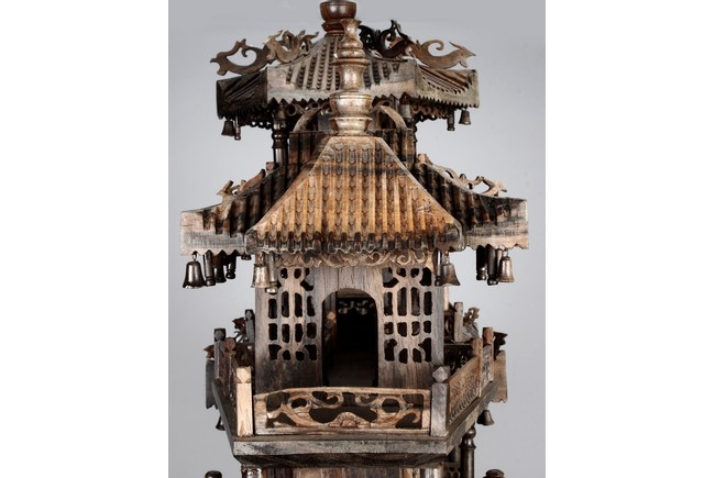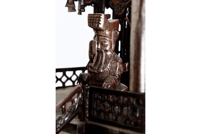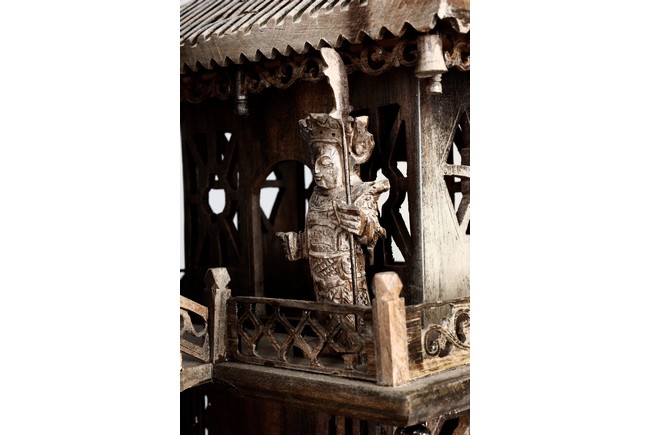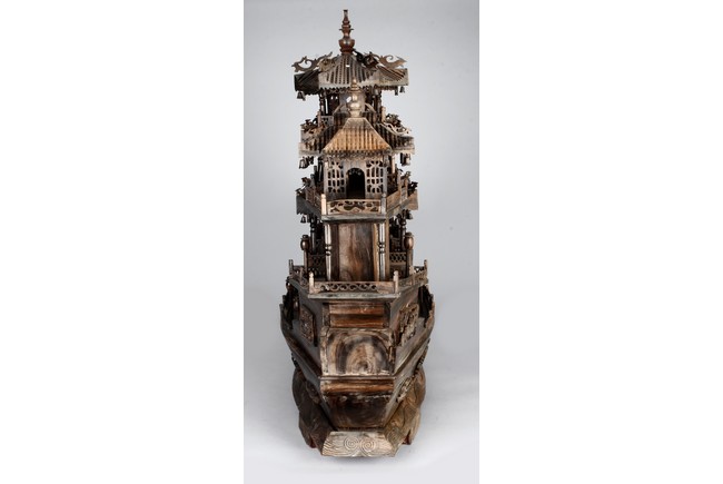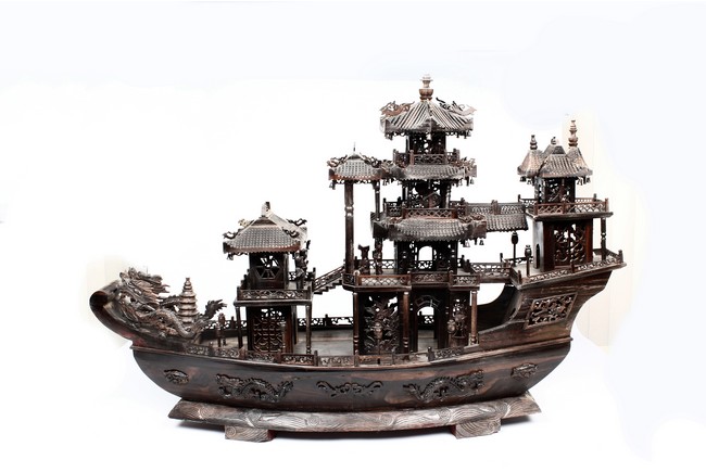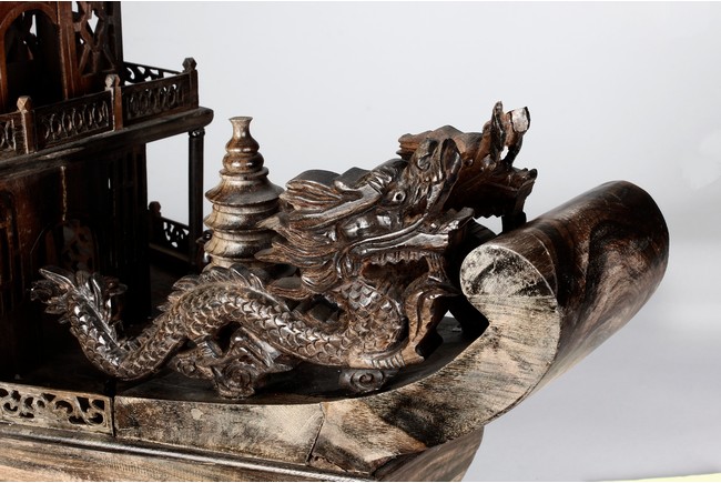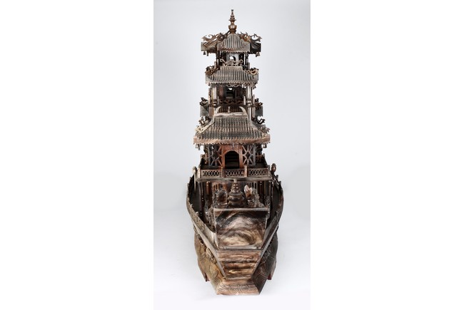 Finely carved and pierced as large boat with two dragons as prow and the deck surmounted with intricate pagodas with variously shaped Buddhist emblems openwork as windows, the structures linked to each other in bridges, with wooden figures upon the pagoda