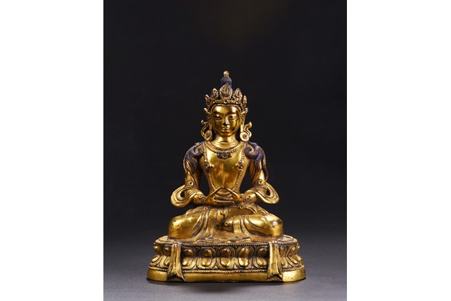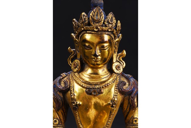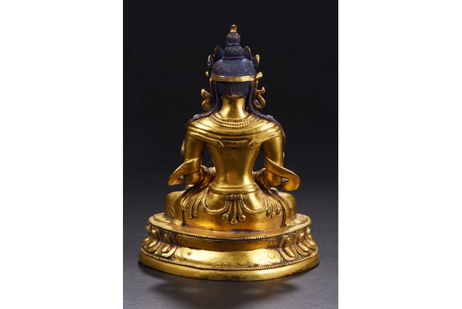 Seated in dhyanasana on a double-lotus base, the hems of his voluminous dhoti incised with a foliate motif adorned with a flowing sash over both arms, an elaborate beaded belt and various necklaces, the face with downcast eyes flanked by lotus earrings and flowing ribbons surmounted by a jeweled tiara, the hair pulled into a high chignon, the base sealed with a double-vajra. Qing Dynasty period.