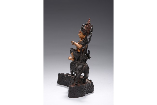 The fierce-looking deity is modelled with fanged teeth and bulging eyes. She is seated on a harnessed donkey, with one hand raised. The base is modelled in the form of crashing waves within rockwork. Republic period.