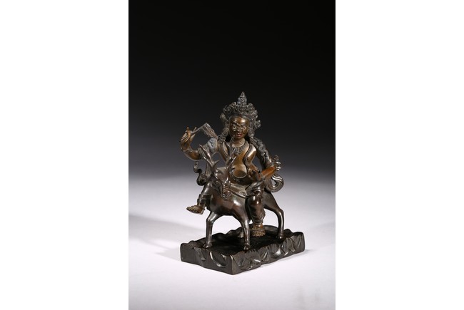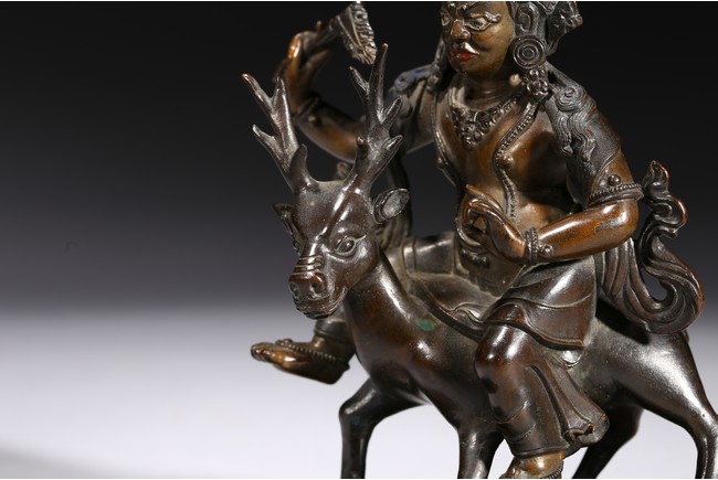 The guardian deity is shown seated upon a deer, both of hands holding an attribute, dressed in dhoti with flowing ribbons across arms, adorned with beaded necklace and face with stern expression, wearing pointed crown, and hair tied into high chignon.